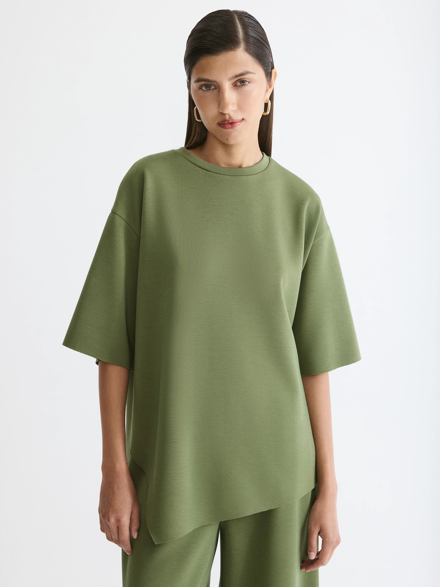 Блуза свободного кроя в благородном оливковом - незаменима для повседневной носки. Короткие рукава со спущенным плечом и круглый вырез создают актуальный силуэт, идеально ровные срезы с эффектом "необработанного края" делают модель легкой.