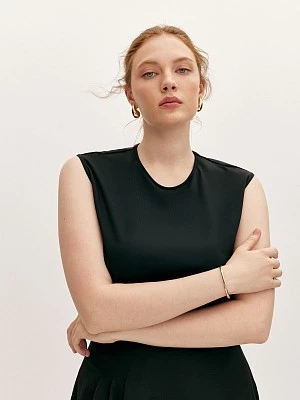 Невесомый топ универсального черного цвета - идеальный выбор для тех, кто ценит комфорт и стиль в одежде. Шелковистая текстура нежно ощущается на коже. Модель прямого силуэта без рукавов, среднего объёма, с круглым вырезом горловины. Топ легко сочетать как с деловыми брюками или юбками, так и дополнить образы в стиле smart casual.