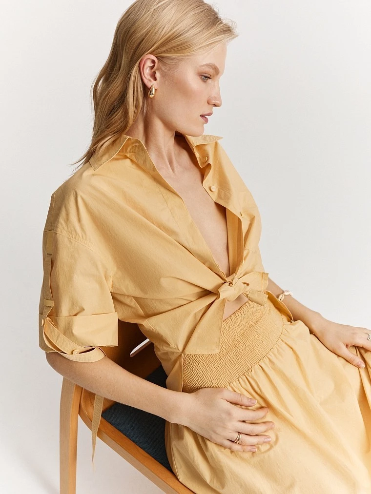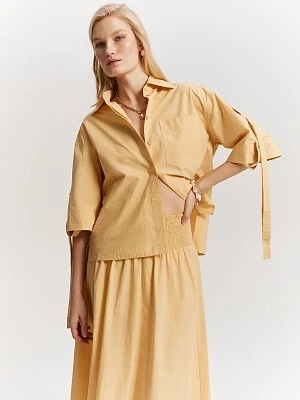 Современная укороченная рубашка мягкого жёлтого оттенка выполнена из качественного 100% хлопка с легким краш-эффектом. Особое плотное переплетение нитей позволяет изделию отлично держать форму. Модель дополнена отложным воротником, застёжкой на планку с потайными пуговицами и накладным карманом на груди. Короткий рукав с длинными патами и фирменным патчем подчеркнет легкость летнего образа. Рубашка станет ярким акцентом в гардеробе, а в сочетании с широкой юбкой-миди из коллекции создаст стильный total look.