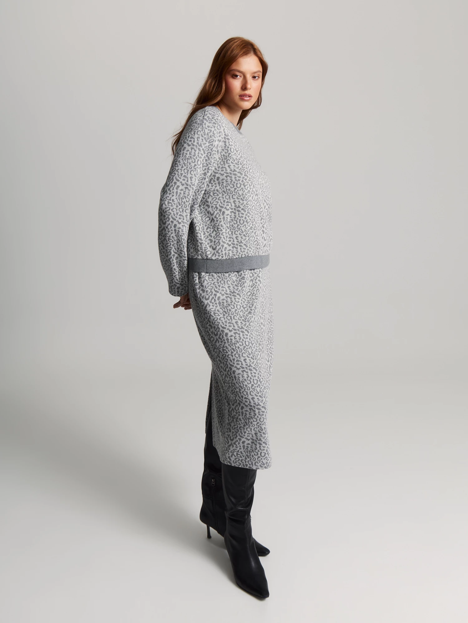 Стильный леопардовый принт в серой гамме выглядит эффектно и универсален в сочетаниях. Блуза легко сочетается с однотонными юбками и брюками, а также с юбкой SK0599K.