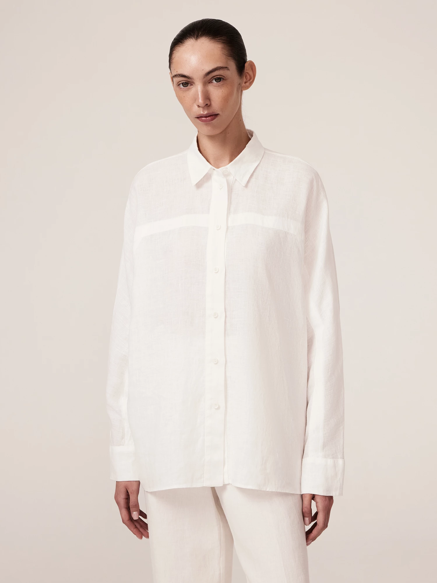 Белоснежная блуза, сочетающая в себе классическую эстетику с современным подходом. Свободный силуэт, лишённый излишней строгости, делает её одинаково уместной как в офисе, так и на прогулке, а экологичность натурального материала отвечает самым взыскательным требованиям осознанного потребления. Знаменитый белорусский лен от легендарного «Оршанского льнокомбината» — это обязательный элемент базового летнего гардероба. Натуральный лен обладает уникальной терморегуляцией: его волокна регулируют микроклимат, отводя влагу в жару и сохраняя тепло при лёгком похолодании. Лен удивительно износостоек — чем больше носишь, тем мягче и выразительнее становится его фактура, кроме того, лен антибактериален и гипоаллергенен. Продуманный до мелочей крой превращает эту вещь в универсального помощника вашего гардероба. Отложной воротник на отрезной стойке и длинные цельнокроеные рукава с манжетами позволяют носить её и как самостоятельную рубашку, и как стильный второй слой. Традиционная застёжка на пуговицы вдоль всего полотна придаёт образу собранность и дисциплинированность, в то время как кокетка по спинке и полочке, разработанная с особым вниманием к анатомии, создаёт невероятную свободу движений. Эта деталь кроя не просто выводит комфорт на новый уровень, но и формирует идеальную линию плеча, которая мягко подчёркивает естественные пропорции.