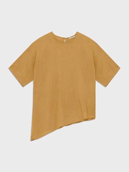 Блуза в кэжуальном стиле из струящейся высокотехнологичной ткани, тактильно напоминающей мокрый шелк, демонстрирует выраженный, вертикально направленный эффект крэш. Долгое воздействие пресса на синтетическую ткань сформировало интересное явление «свет-тень», благодаря которому модель переливается на свету. Активный цвет «янтарное золото» подходит как для носки в формате костюма, так и послужит в качестве цветового акцента в сочетании с базовыми оттенками. Круглый вырез блузы минималистичен и не перегружает образ. Цельнокроеный рукав комфортен и позволяет не прерывать линии на фактурной ткани вытачками. Асимметрия модели способствует вертикализации силуэта и расширяет стилистические возможности изделия, позволяя носить блузу как тунику. Модель можно сочетать со струящимися брюками из капсулы в том же цвете охры, с джинсами или легкими брюками из однотонной или принтованной ткани.