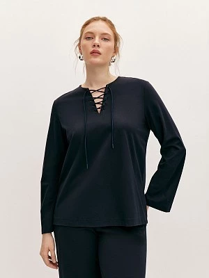 Трикотажная блуза практичного тёмно-синего цвета. Фирменный материал на основе мягкой вискозы и эластичного нейлона достаточно плотный и не вытягивается со временем. Модель прямого силуэта со спущенной линией плеча, увеличенного объёма, длинным втачным рукавом и боковыми разрезами по низу изделия. V-образный вырез горловины декорирован люверсами и шнуром. Свободный крой обеспечивает не сковывающую движения посадку. Отлично составит однотонный комплект для путешествий или прогулок с брюками из того же материала.