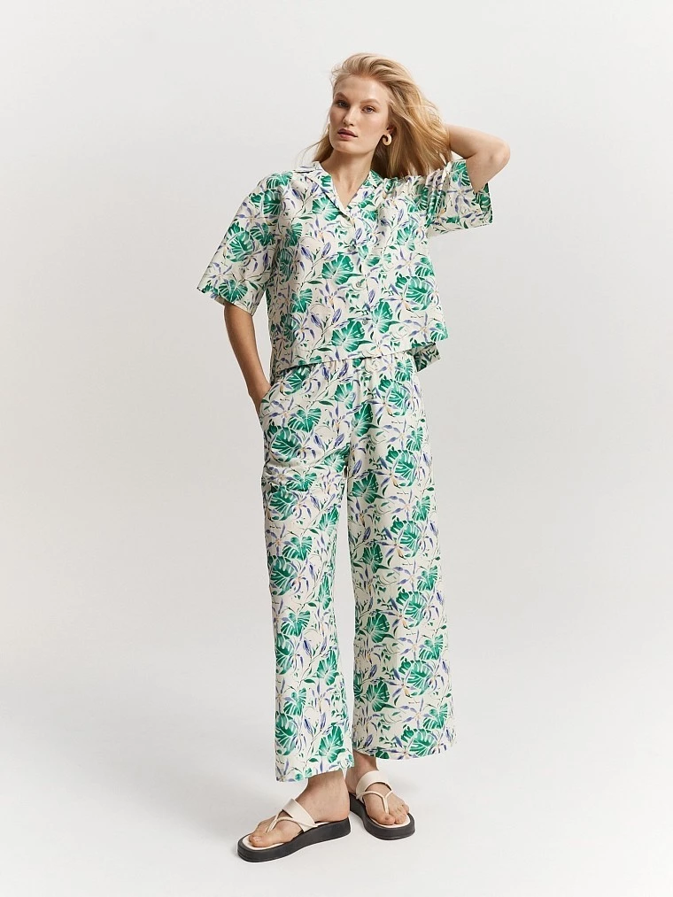 Свободная рубашка в гавайском стиле с дизайнерским цветочным принтом в бело-зеленой гамме. Премиальная хлопковая ткань приятна к телу, а благодаря плотному переплетению нитей изделие отлично держит форму. Модель прямого силуэта с аккуратным отложным воротником, центральной застёжкой на пуговицы и крупным накладным карманом на груди. В сочетании со свободными брюками из этой же ткани составит современный однотонный total look.