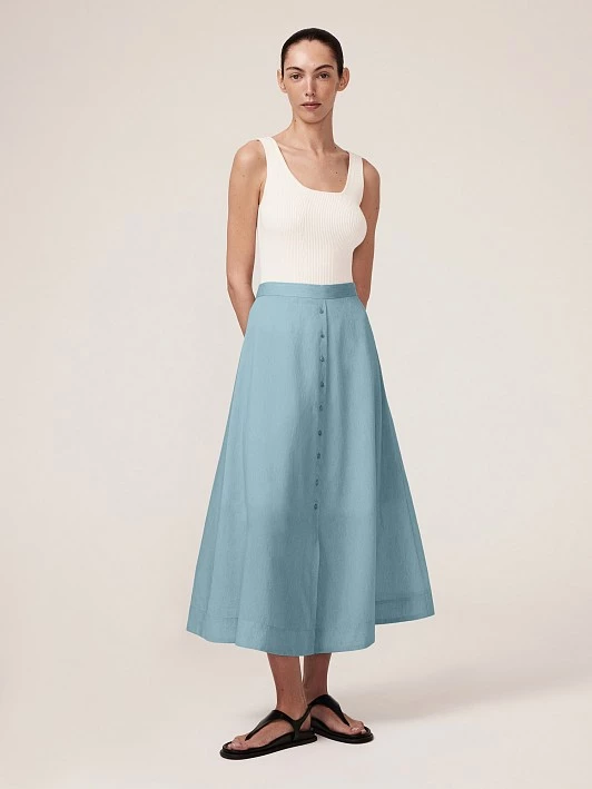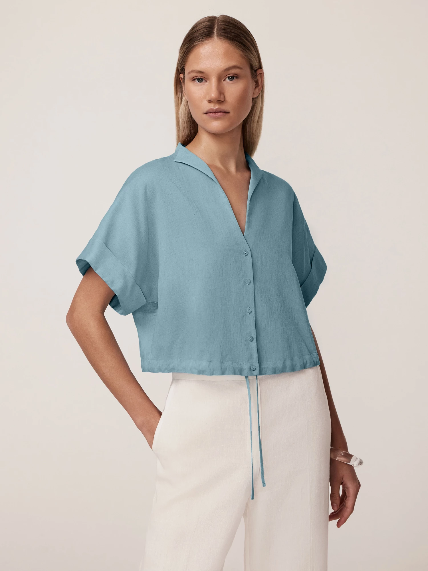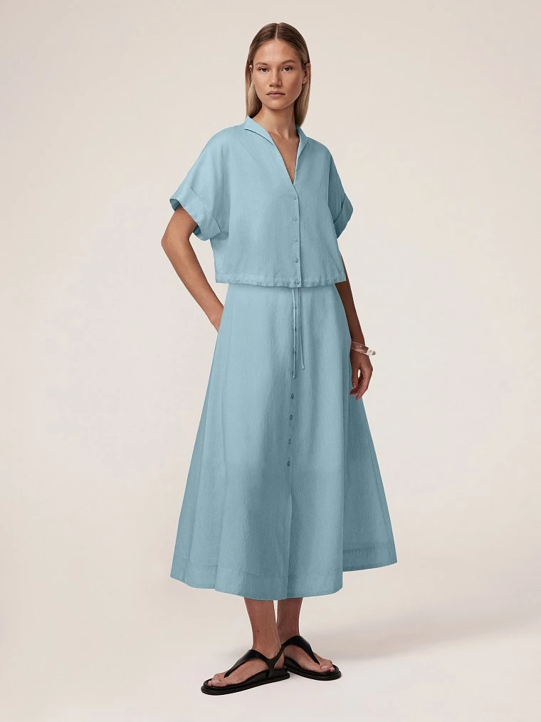Созданная в стиле романтичного минимализма, блузка по-настоящему многогранна. Слегка заутюженные отвороты горловины формируют элегантный V-вырез, подчеркивающий женственную линию ключиц. Цельнокроеный рукав с отворотами — оптимальное решение, позволяющее отказаться от классических вытачек, сохранив гладкость ткани, такой прием обеспечивает безупречную посадку, сохраняя свободу движений и расширяет стилистическую вариативность модели. Укороченная длина формирует современную пропорцию, идеально сочетаясь с высокими брюками или юбками и подчеркивая линию талии, в то время как лёгкий напуск по низу добавляет объём, создавая воздушную динамику и обеспечивая дополнительный комфорт. Нежный молочно-голубой оттенок, напоминающий летнее небо, придаёт образу выразительность и, одновременно, благородную сдержанность, прекрасно вписываясь в философию «тихой роскоши». Такой оттенок — универсальная основа для создания гардероба в стиле quiet luxury, где каждая деталь, в том числе и выбранная ткань, говорит об изысканном вкусе без лишней демонстративности. Созданная из гармоничного сочетания вискозы, льна и нейлона, блуза дарит коже ощущение свежести в летний зной — воздухопроницаемый лён и вискоза обеспечивают идеальную терморегуляцию, впитывая излишки влаги, а нейлон добавляет практичности, сохраняя безупречный вид в течение всего дня. Такая ткань прекрасно драпируется и является идеальным выбором для модели с напуском и дополняющей ее юбки SK0541. Особенности блузы делают ее универсальной, эргономичной и transcends seasons - свободной от трендов инвестицией в безупречный стиль.