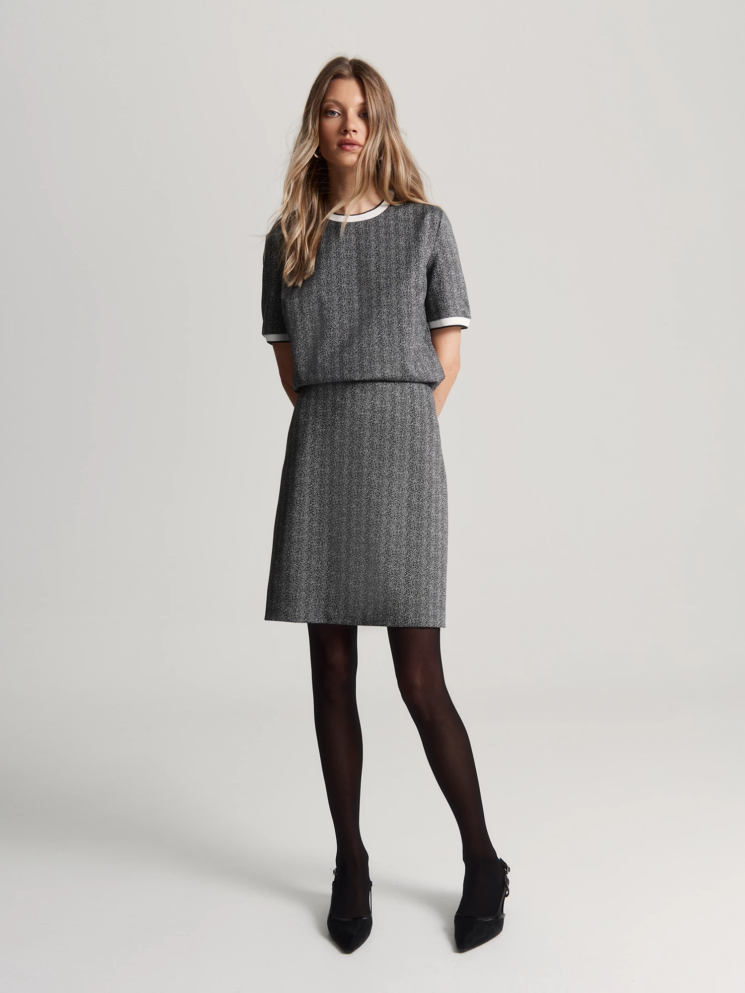 Укороченный крой с круглым вырезом и коротким рукавом создаёт современный силуэт, а нагрудные вытачки обеспечивают идеальную посадку по фигуре.