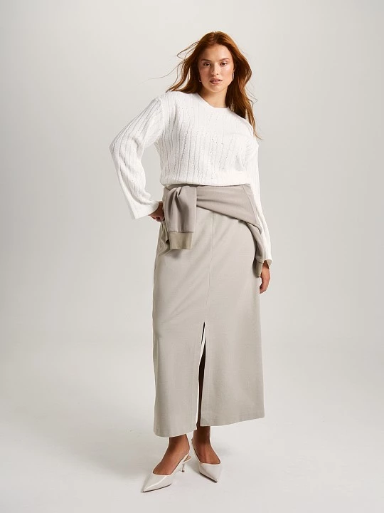 Блуза с аккуратным полуприлегающим силуэтом и минималистичным дизайном — это идеальный выбор для тех, кто ценит стиль и комфорт. Модель отличается небольшим круглым вырезом, который придает ей элегантный вид, и длинными втачными рукавами со спущенным плечом, что создает расслабленный и современный силуэт. Классический белый цвет блузы делает ее универсальной, позволяя легко сочетать с различными аксессуарами и элементами гардероба, что открывает широкие возможности для стилизации. Для изготовления блузы использован качественный смесовый трикотаж с эффектом вязаного ажурного полотна, который представлен в виде вертикальных ломаных линий. Этот прием не только добавляет текстурности, но и соединяет эстетику вязаного трикотажа с прочностью кроеного материала. Использование настоящего подвяза для бейки горловины, выполненного с помощью японской машины Shima Seiki, подчеркивает внимание к деталям и высокое качество исполнения. Смесовое полотно обладает множеством преимуществ: оно приятно на ощупь, не подвержено усадке, что гарантирует долговечность изделия, и имеет устойчивость к многократным стиркам. Кроме того, блуза отличается низкой сминаемостью, что делает ее идеальной для повседневной носки и путешествий. Эта модель станет отличным дополнением к любому гардеробу, позволяя создавать как повседневные, так и более формальные образы. Благодаря своему лаконичному дизайну и качественным материалам, блуза легко впишется в капсульный гардероб, обеспечивая стильный и комфортный вид в любых ситуациях.