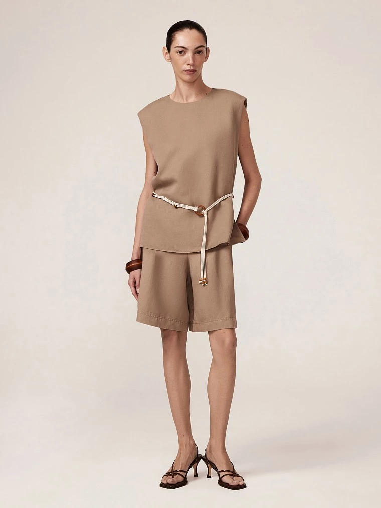 Созданная из турецкой ткани на основе льна и тенселя, блузка сочетает в себе мягкость, шелковистость и натуральную текстуру, создает ощущение легкости и комфорта. Лиоцелл (тенсель), полученный из эвкалиптовой целлюлозы, придает модели воздухопроницаемость и шелковистый блеск, а лен добавляет прочность и способность сохранять прохладу, делая модель идеальной для теплого времени года. Блузка хорошо впишется в гардероб благодаря стилю smart casual с элементами рустикального шика. Она одинаково органично смотрится в городской среде и на загородном отдыхе, сочетая в себе практичность и эко-эстетику. Круглый вырез горловины подчёркивает лаконичность дизайна, создавая аккуратный и завершённый силуэт, в то время как структурированная линия плеча с лёгкими подплечниками дисциплинирует образ, деликатно корректируя пропорции без излишнего объёма. Неповторимое очарование блузе придают детали: боковые разрезы, которые обеспечивают свободу движений и визуально вытягивают силуэт, и пояс в технике "макраме" — он не просто позволяет регулировать степень прилегания, подчёркивая талию или бёдра по вашему желанию, но и своей техникой плетения подчеркивает рустикальный стиль, контрастируя с гладкостью ткани. Песочный беж с золотистым подтоном добавляет образу теплоту и универсальность, легко сочетаясь как с нейтральной, в виде брюк TR0591 или шорт SH0046, так и с насыщенной палитрой Вашего гардероба.