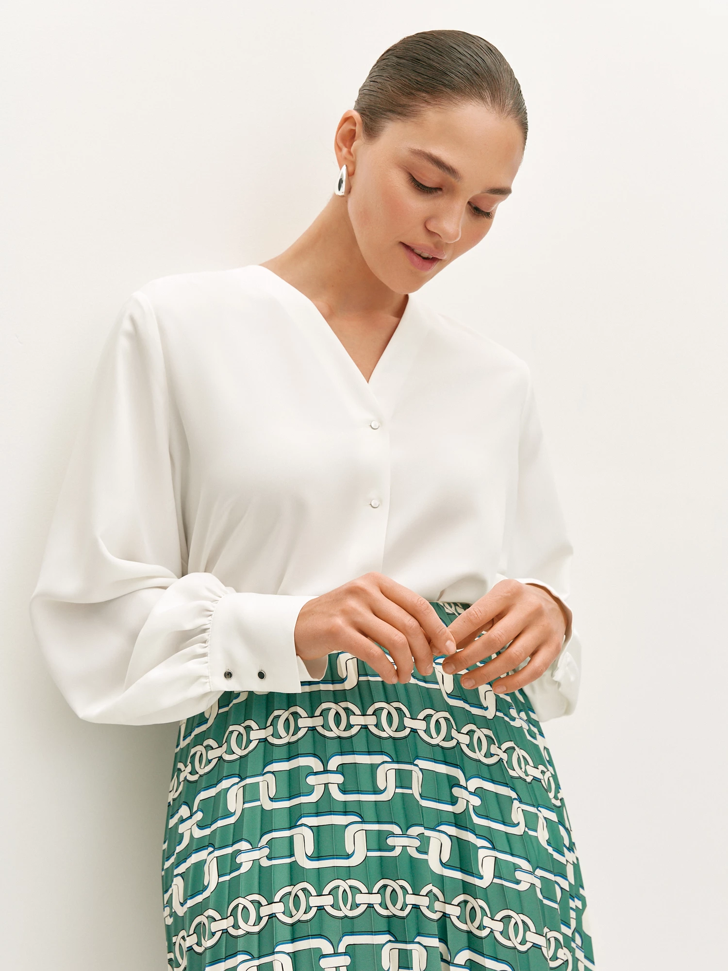 Молочная элегантная блуза с рукавом с пышной сборкой. Трендовая модель с объемными рукавами придает образу легкость и невесомость, а V-образный вырез визуально удлиняет шею. Прочный, износостойкий материал легок в уходе, и надолго станет самостоятельной базовой вещью в вашем гардеробе.