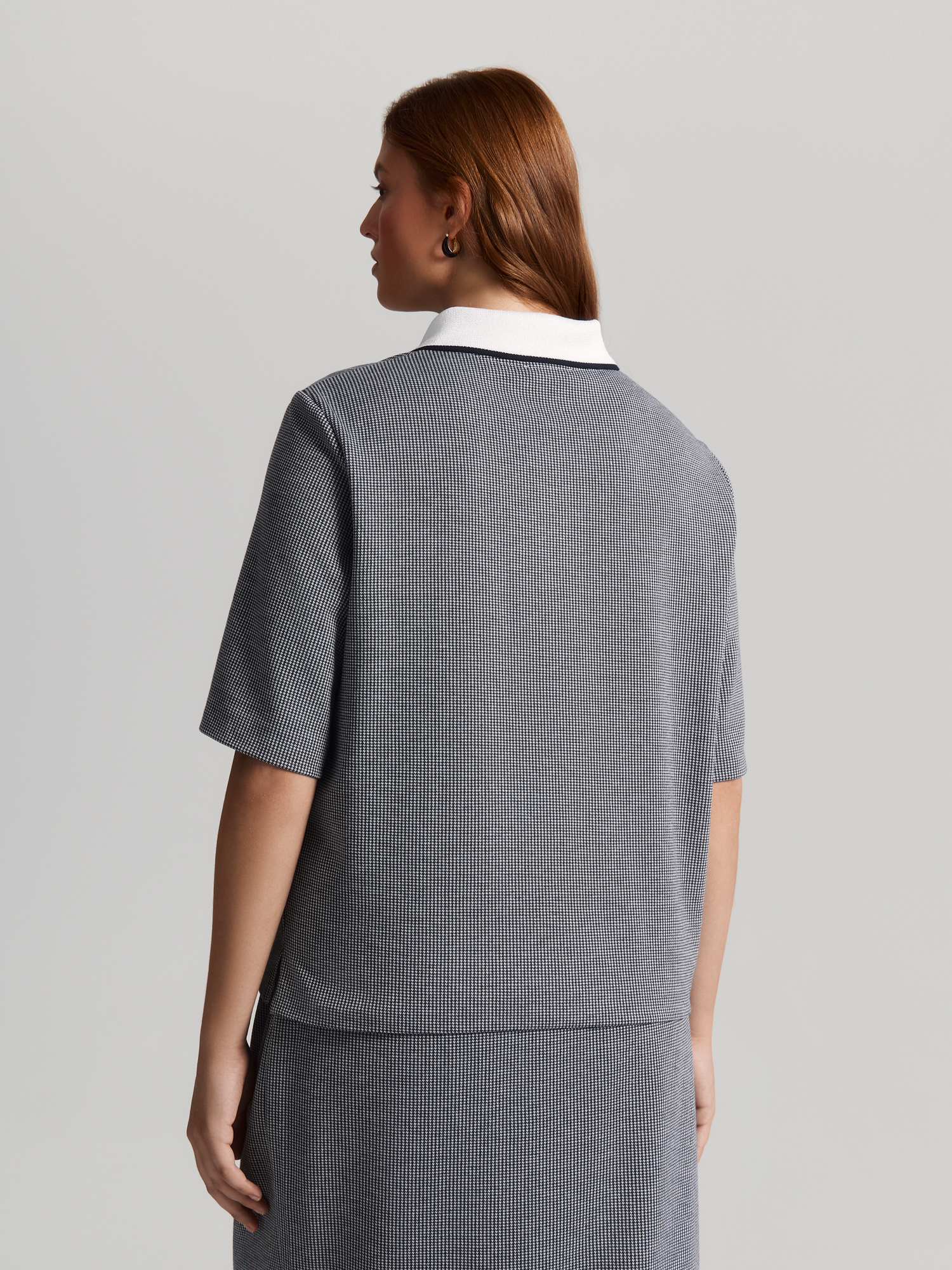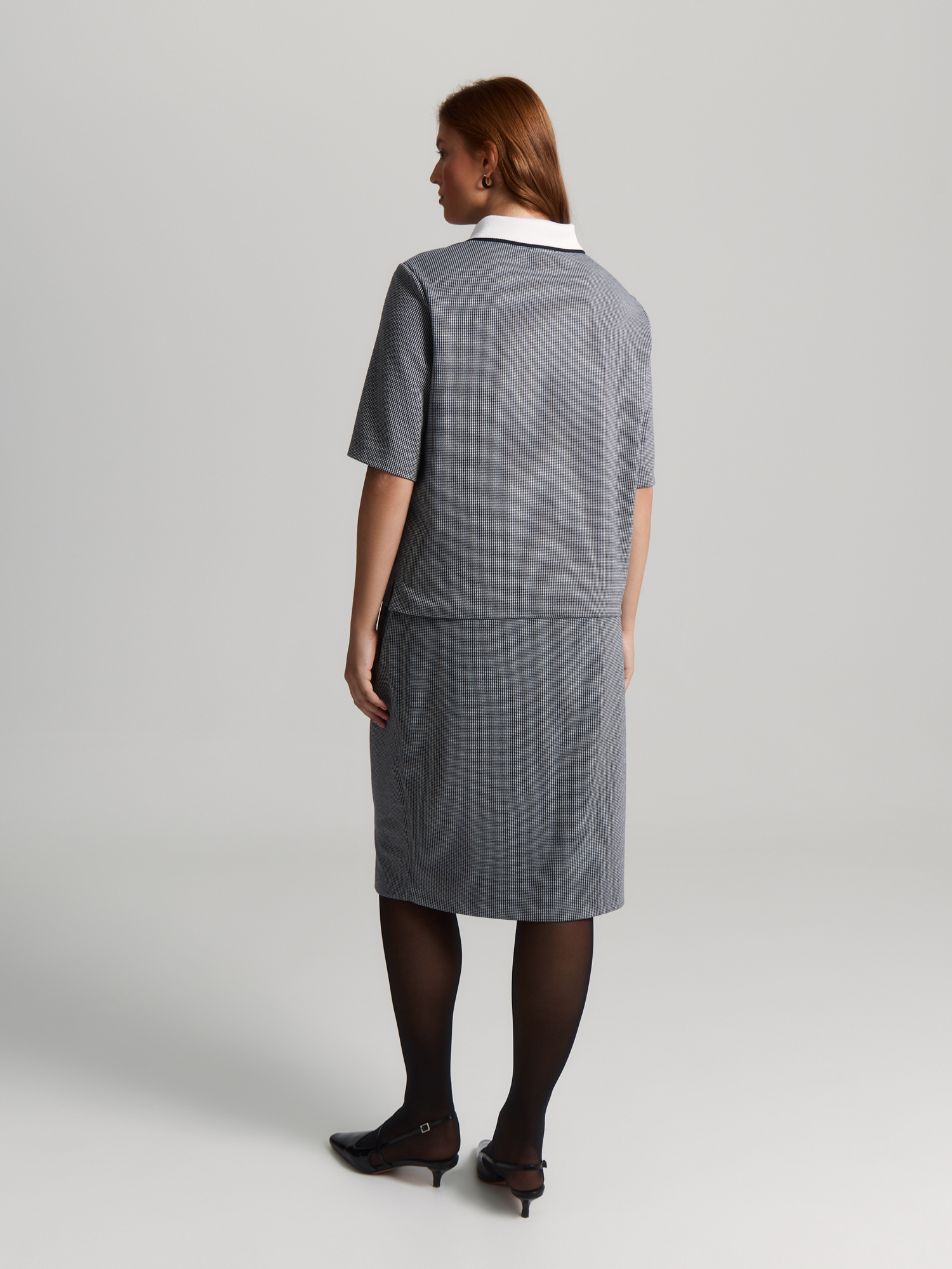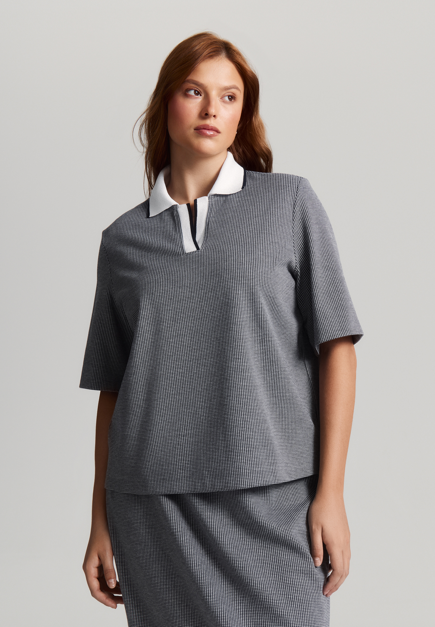 Трикотажная блуза мягко облегает фигуру, сохраняя комфорт. Прямой силуэт с втачным рукавом длины 1/2 и разрезами по низу создаёт расслабленный образ, а вязаный отложной воротник с планкой добавляет стильные нотки поло.
