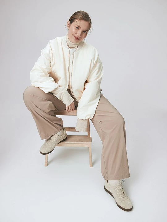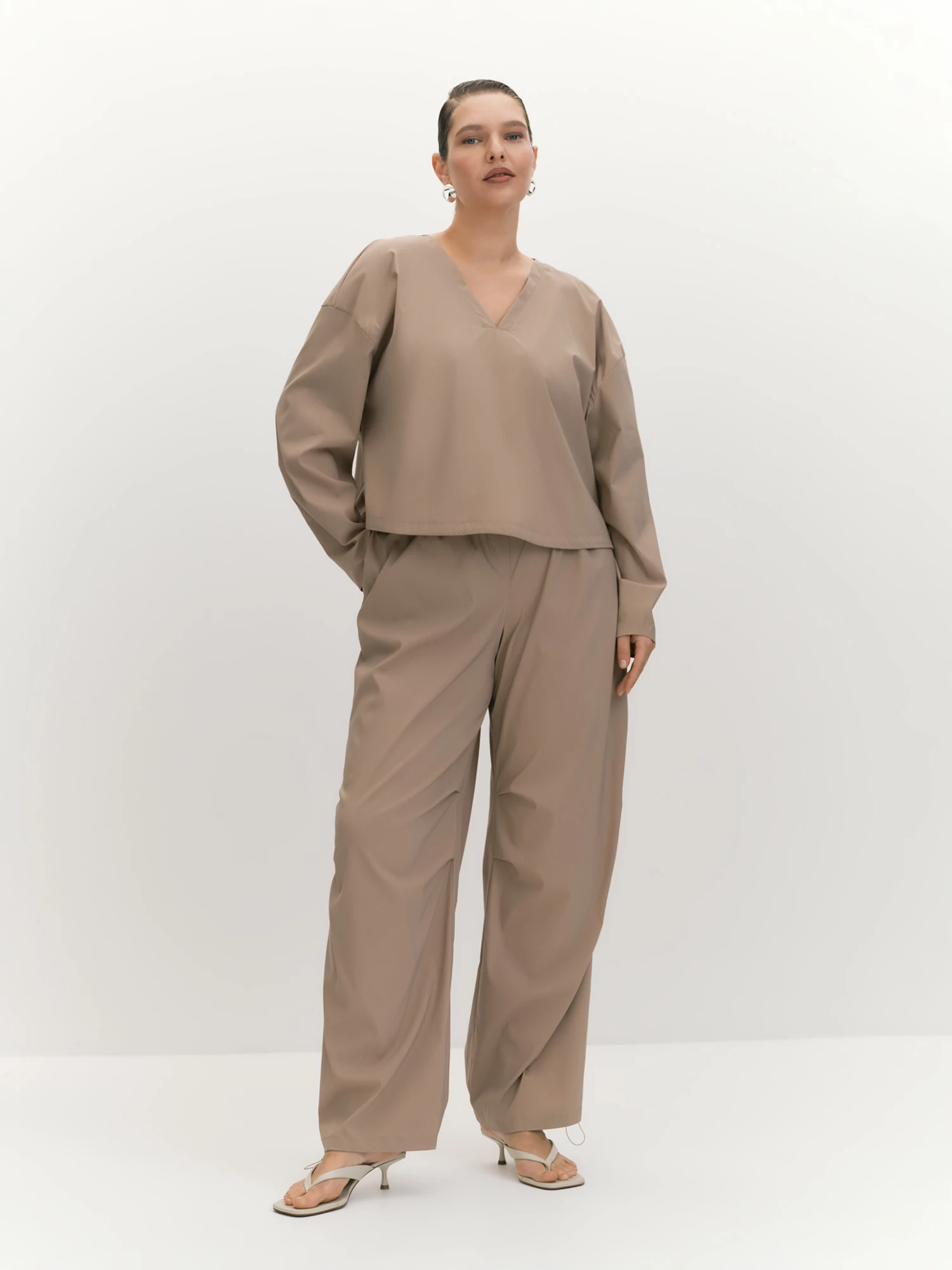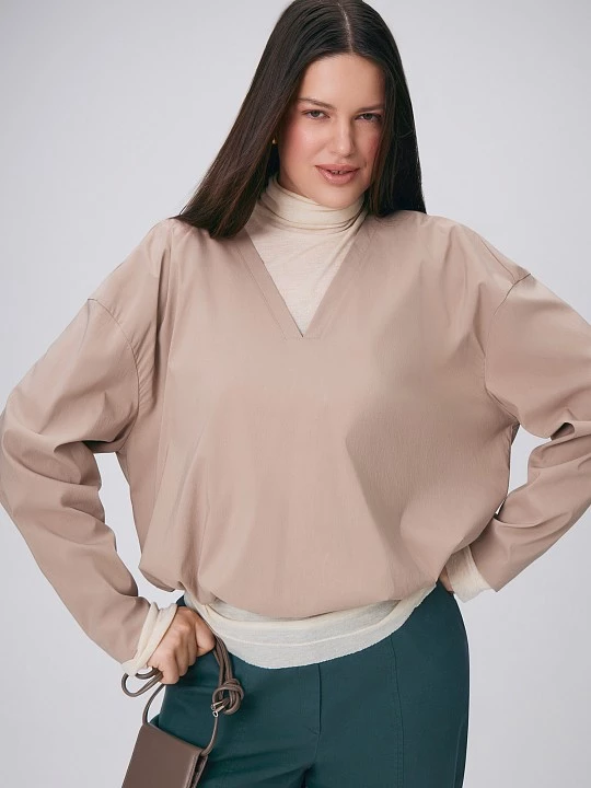 Актуальная модель со слегка спущенным плечом дополнена V-вырезом, визуально удлиняющим шею. Прямой силуэт модели за счет выбранной длины подчеркивает талию, создавая аккуратный вид. Кулиска с фиксаторами по низу позволяет регулировать посадку, учитывая индивидуальные особенности фигуры, а рукава с дизайнерскими защипами по шву гарантируют комфорт и свободу движений, обращая внимание на аккуратность кроя. Приглушенный темно-бежевый с серебристым подтоном добавляет элегантности и изысканности, делая модель идеальным выбором для тех, кто ценит внимание к деталям и стремится подчеркнуть свою индивидуальность. Мягкая и эластичная ткань на основе вискозы обеспечивает комфорт, долговечность, а также объединяет свитшот с брюками-карго, выполненными в том же стиле. Такой свитшот — идеальное сочетание городского стиля и функциональности.