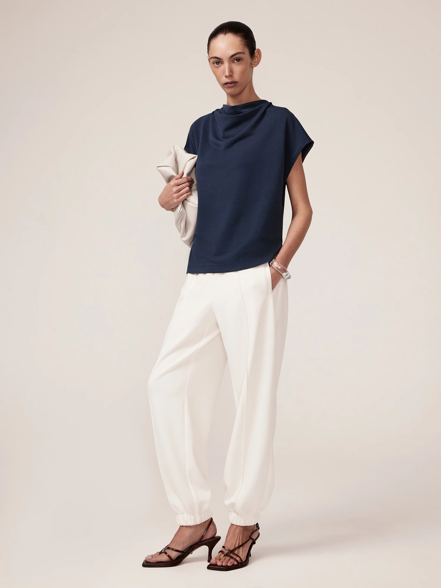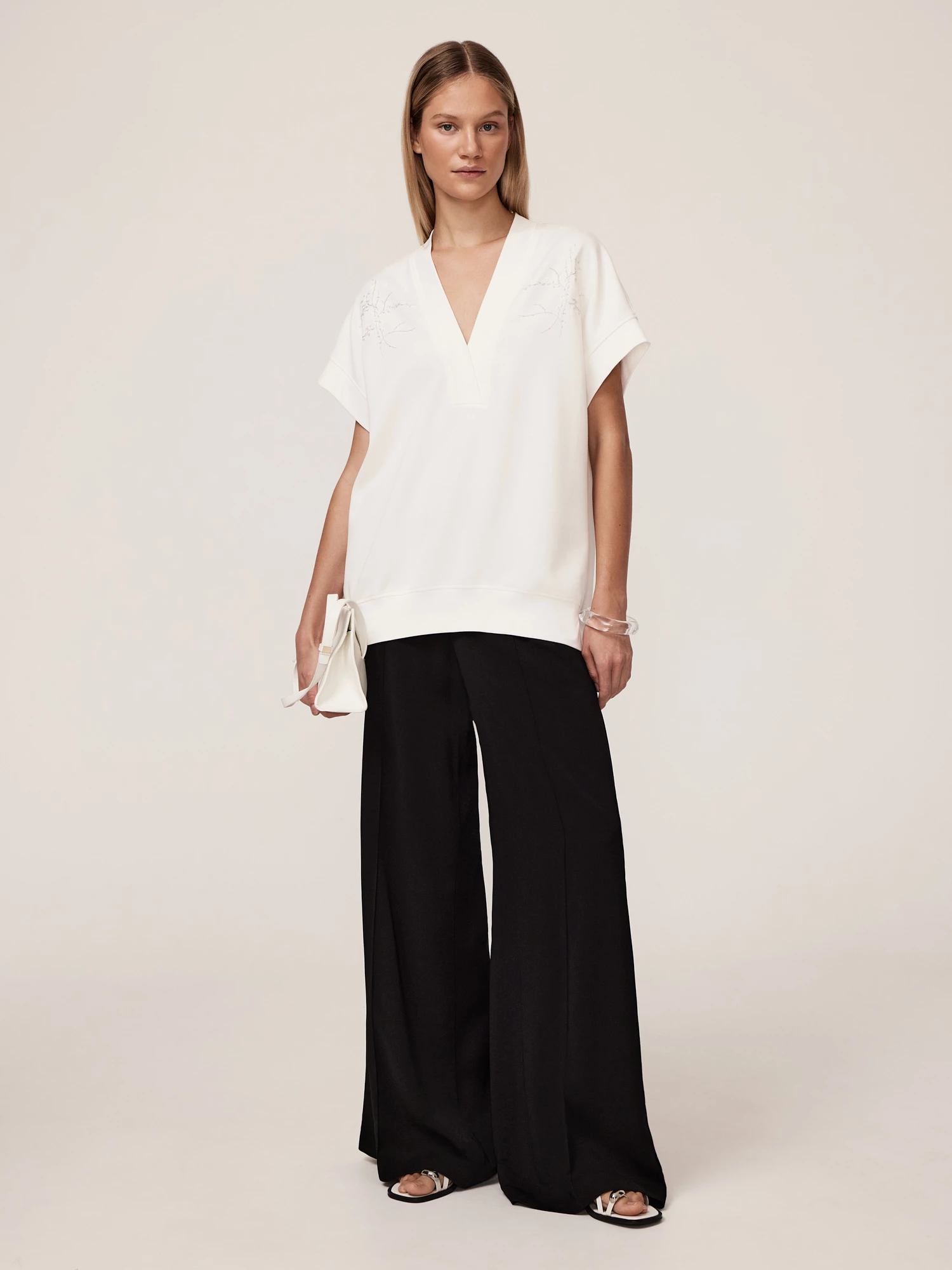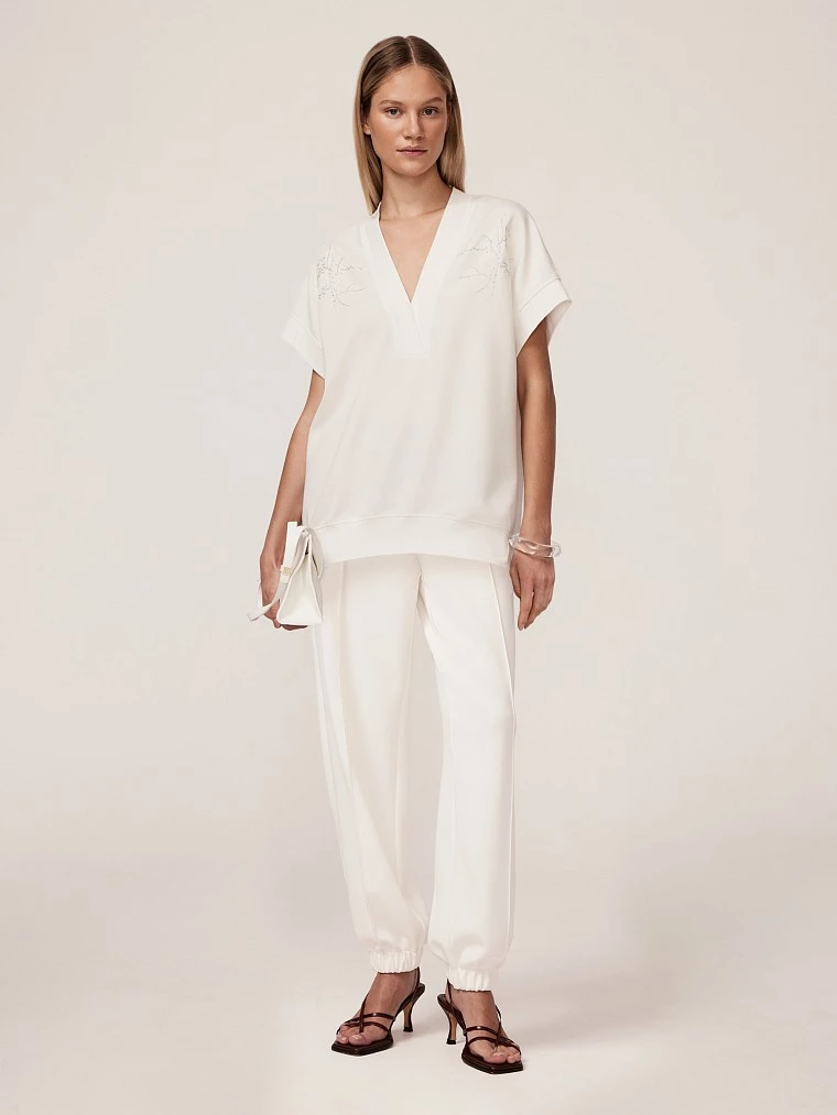 Блуза из мягкого трикотажа с добавлением модала эффектна как нарядная блуза и комфортна как свитшот, она выполнена в стиле "современный кэжуал" с элементами спорт-шик и романтики. Модал — мягкое, гладкое и дышащее волокно, полученное из целлюлозы, которое обеспечивает комфорт и приятные тактильные ощущения. Полиэстер добавляет износостойкость и легкость в уходе, а спандекс отвечает за эластичность. Ткань свитшота приятна к телу, устойчива к деформации, сохраняет форму и обеспечивает долговечность, делая модель практичной для повседневной носки. V-вырез и спущенная пройма обработаны тактильно приятной обтачкой из трикотажа «рибана» на основе хлопка. Спущенная пройма обеспечивает удобство и свободу движений, добавляя образу непринужденности. Правильная посадка по плечам обеспечена кокеткой на спине, подчеркивающей качество кроя и пошива. Симметричная вышивка на груди, выполненная на собственном производстве с помощью японского оборудования Tajima, добавляет элемент дизайна, делая блузу более интересной и стильной, особенно потому, что рисунок вышивки повторяет цветочные мотивы основного принта капсульной коллекции, ставшего ее лейтмотивом. Блуза отлично сочетается с трикотажными брюками из капсулы. Базовый белый - универсальный цвет, который легко сочетается с другими оттенками, что делает костюм универсальным элементом гардероба.