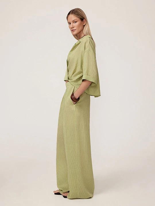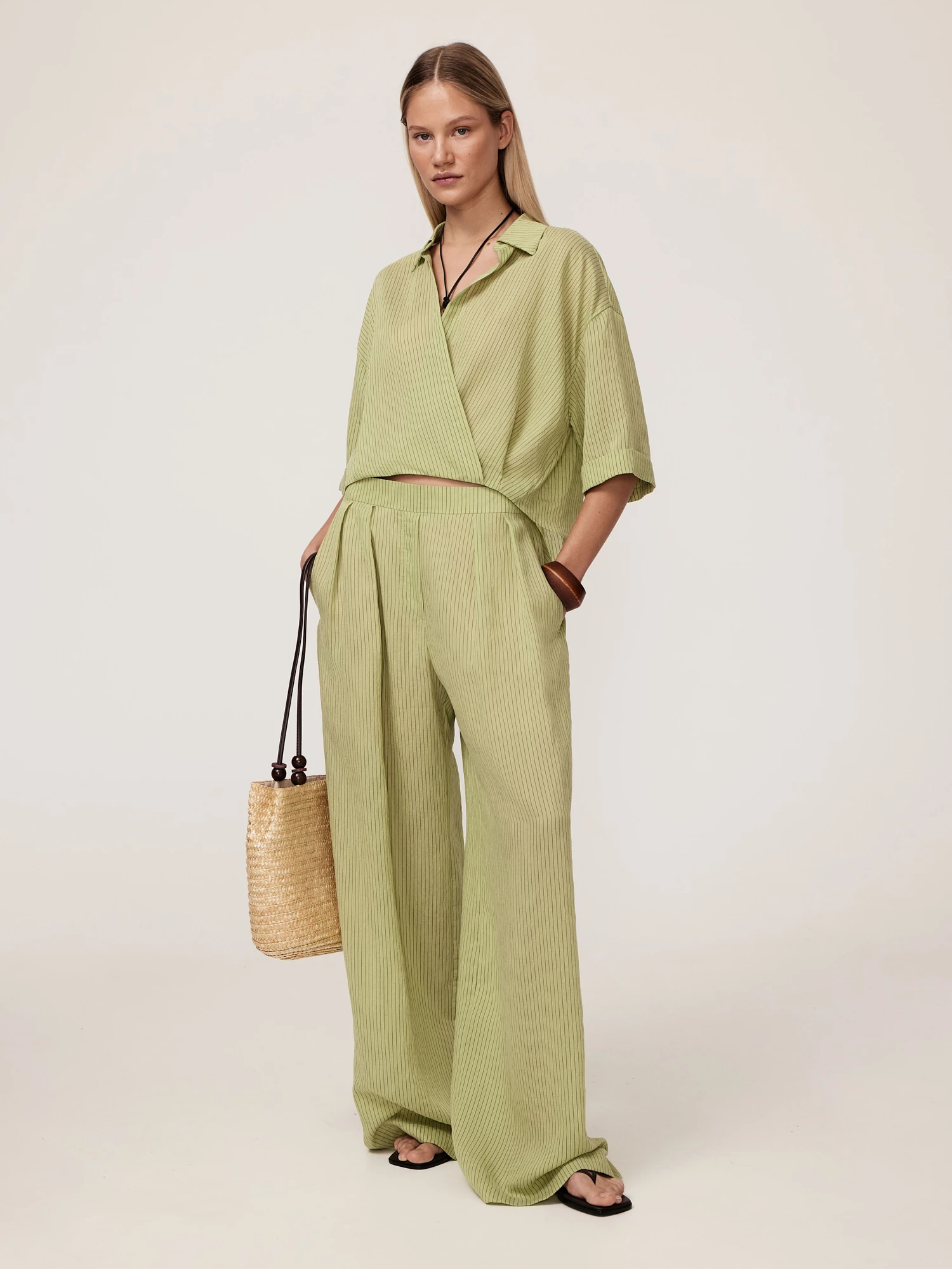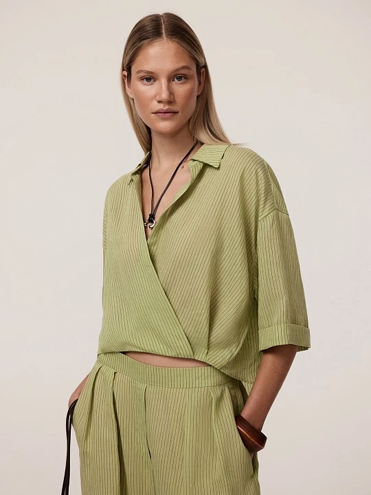 Блуза является ярким представителем кэжуальной эстетики с элементами классики. Её О-образный крой с асимметричным низом оригинален, подчеркивает женственность и добавляет образу легкости. Отложной воротник и V-вырез, образованный фиксированным запахом, это детали классического дизайна, которые подчеркивают изысканность и стиль. Спущенное плечо и рукава с отворотами удобной длины 3/4 обеспечивают комфорт и свободу движений, добавляют образу непринужденности. Спинка с кокеткой и встречной складкой подчеркивает качество пошива и добавляет необходимый объем, создавая интересный акцент. Блуза выполнена из современной смесовой ткани на основе лиоцелла, который, подобно вискозе, производится из целлюлозы эвкалиптовой древесины. Полиамид придает ткани деликатный блеск, а полиэстер добавляет прочность. Оттенок «зеленая лилия», напоминающий цвет светлого лайма, добавляет образу легкости, делая его подходящим для весенне-летнего сезона. Игольчатая полоска привлекает внимание, не перегружает образ и расширяет вариативность стилистических сочетаний блузы.