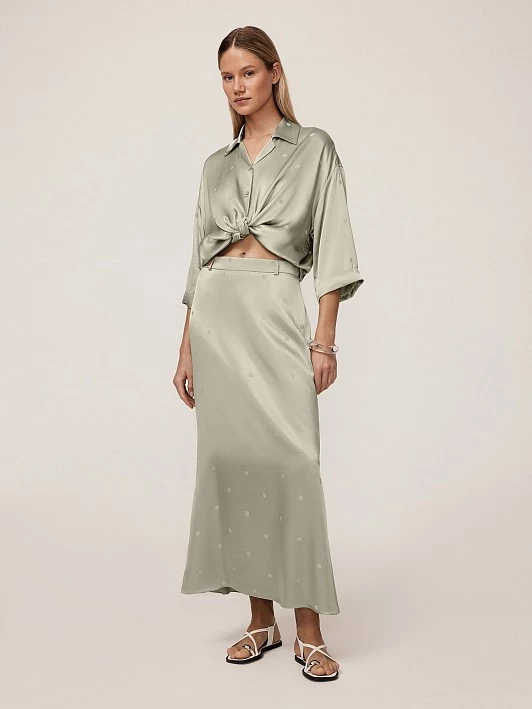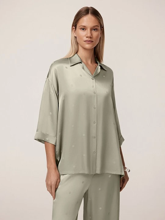 Убедительный в своей универсальности, костюм в пижамном стиле можно носить и как праздничный, и как повседневный. Блуза выполнена с отложным воротником «camp» (рус. «кэмп»), часто встречающимся у мужских рубашек, такой крой оригинален и вызывает визуальный интерес. Модель с укороченным рукавом, дополненным отворотом, что также необычно для пижамного стиля, имеет все же центральную застежку на пуговицы. Свободный силуэт блузы сочетается со спущенным плечом и разрезами по боковым швам и позволяет чувствовать себя комфортно и расслабленно. Обращает на себя внимание фактура ткани – это шелковый жаккард из 100% вискозы в актуальном светло-оливковом. Эффектный внешний вид, высокая прочность и устойчивость к деформациям – неоспоримые преимущества такого полотна, а привлекательный дизайн сразу обращает на себя внимание. Набор характеристик жаккардового полотна позволяют рассматривать его как долгосрочную инвестицию в предмет одежды. Актуальный оттенок "камень" привнесет в гардероб свежесть и гармонию.