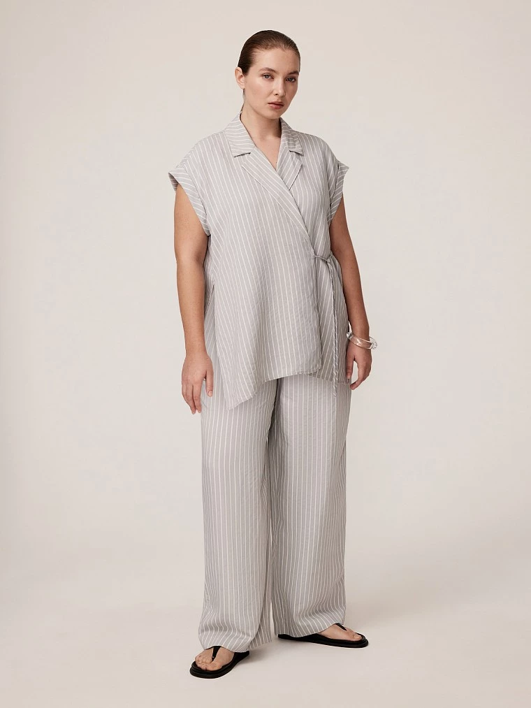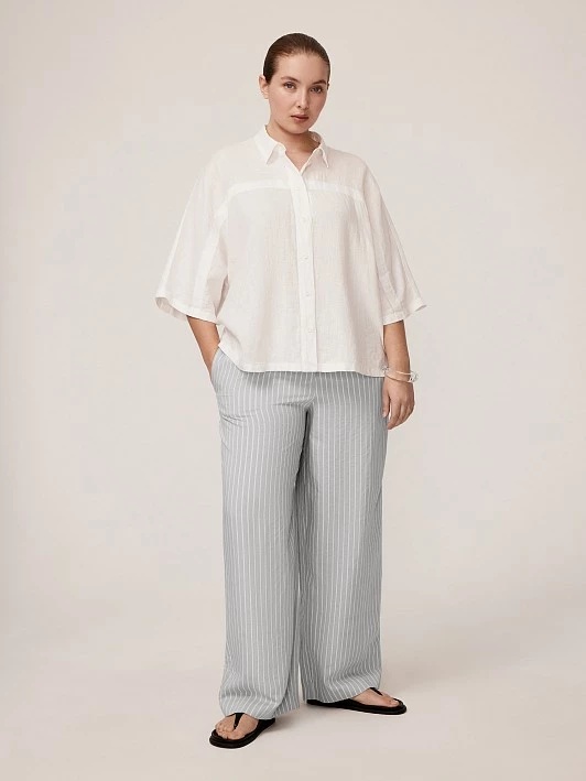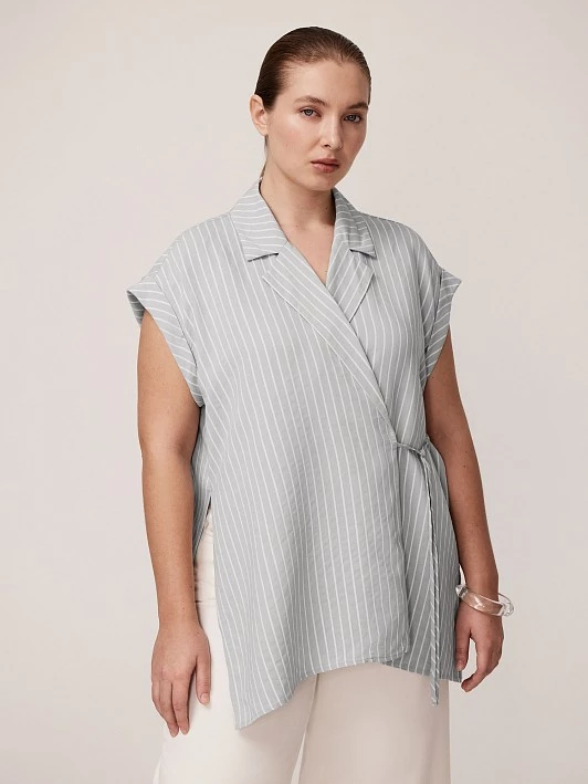 Модель выполнена в стиле "классический кэжуал" с элементами утонченности. Туманный серый в белую в сочетании с бежевой игольчатой полоской гармоничен и практически универсален в сочетаниях. Полоска – модный тренд любого сезона - обладает способностью визуально изменять телосложение. Классический английский воротник и рукава с отворотами дисциплинируют модель. ЗапАх отражает стремление дизайнеров к асимметрии. Высокие разрезы комфортны и обеспечивают удобный вход в карман брюк или юбки. Блуза выполнена из турецкой вискозной ткани с небольшим добавлением поливолокон. Вискоза обеспечивает мягкость, легкость и приятные тактильные ощущения. Она хорошо пропускает воздух, что делает модель комфортной для носки. Полиэстер отвечает за прочность и долговечность изделия. Носите с брюками в такую же полоску или с однотонным низом.