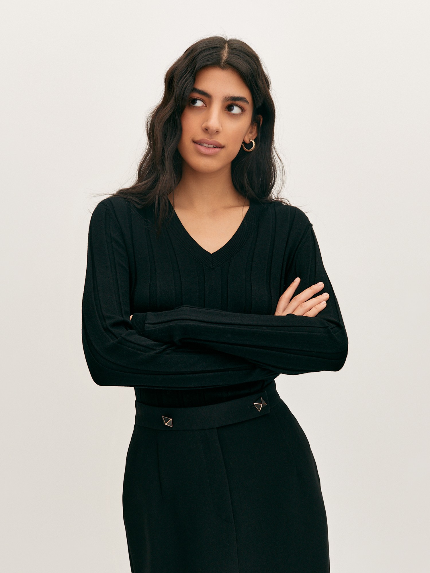 Чёрная вязаная блуза в крупный фактурный рубчик. Выполнена в технике эластичной вязки из мягкой фирменной пряжи на основе дышащей вискозы. Модель прилегающего силуэта, с длинным втачным рукавом и V- образным вырезом горловины, обработанным подвязом. Нижний край декорирован металлическим украшением. Комфортную блузу легко сочетать с брюками, юбками или джинсами.