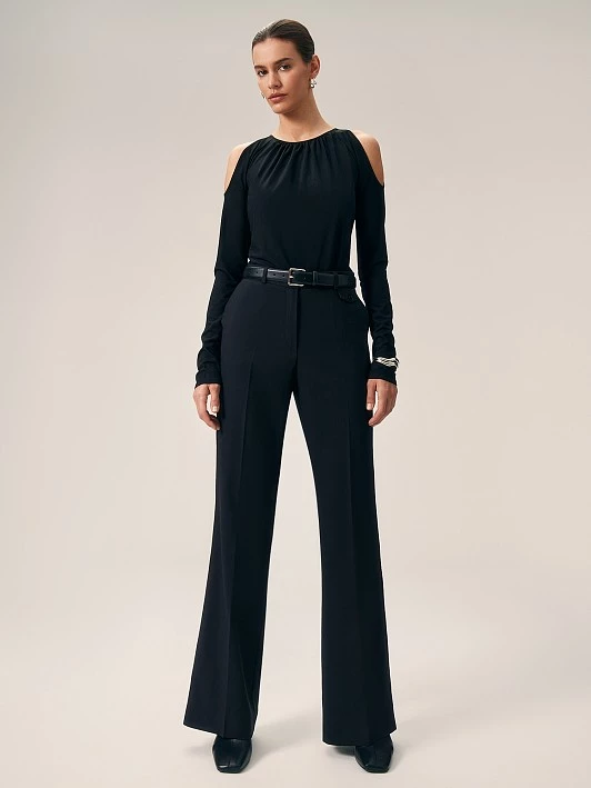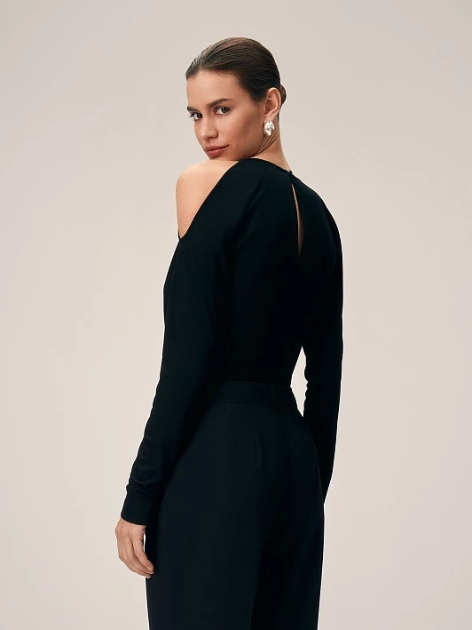 Модель с круглой горловиной, длинным рукавом-реглан и симметричными вырезами на плечах. Легкая сборка по вырезу горловины компенсирует отсутствие вытачек. Боди выгодно облегает тело, подчеркивает линии фигуры. Для модели такого кроя и прилегания выбрали трикотажное полотно из эластичного высокотехнологичного полиэстера. Тонкая износостойкая ткань привлекательно драпируется и тактильно приятна. Такой верх можно носить с классическими брюками, джинсами, юбками-карандаш или А-силуэта. Особенно удобно сочетать боди с низами, у которых особая посадка по талии - заниженная или наоборот высокая. Стильная блуза в классическом базовом черном будет востребована как офисная, деловая, повседневная, нарядная, вечерняя, новогодняя.