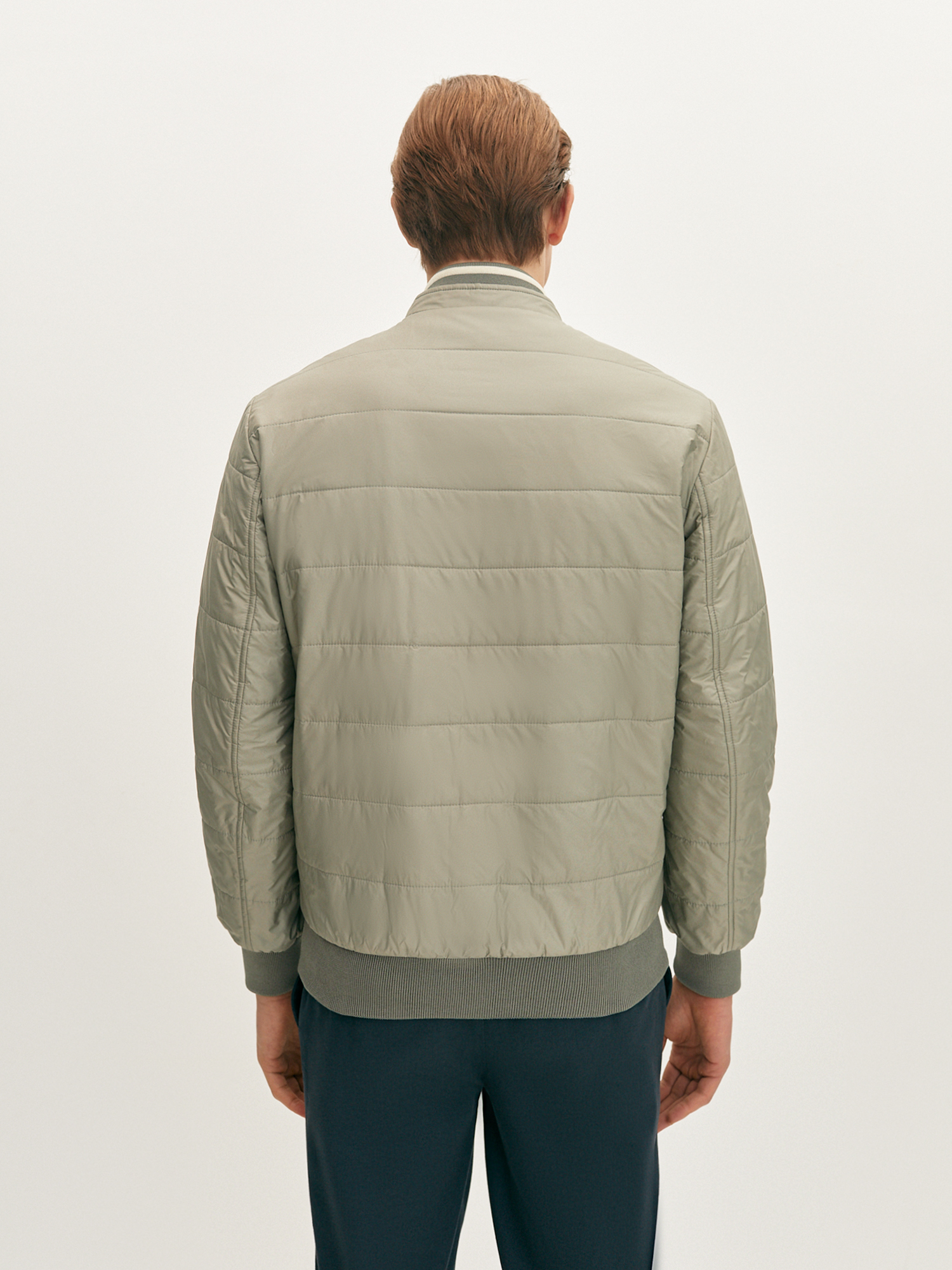 Современный стеганый бомбер серо-зеленого оттенка выполнен из прочного материала, который быстро сохнет и легко очищается от загрязнений. Тонкий слой утеплителя поддерживает комфортную температуру и не создает лишний объем. Модель на молнии с воротником стойкой на кнопке, дополнена карманами с листочкой на молнии. Трикотажные манжеты и резинка по низу изделия обеспечивают лучшую посадку и сохраняют тепло. Такое изделие обеспечит комфорт в прохладную весеннюю погоду и идеально подойдет для неформальных образов с джинсами и чиносами.