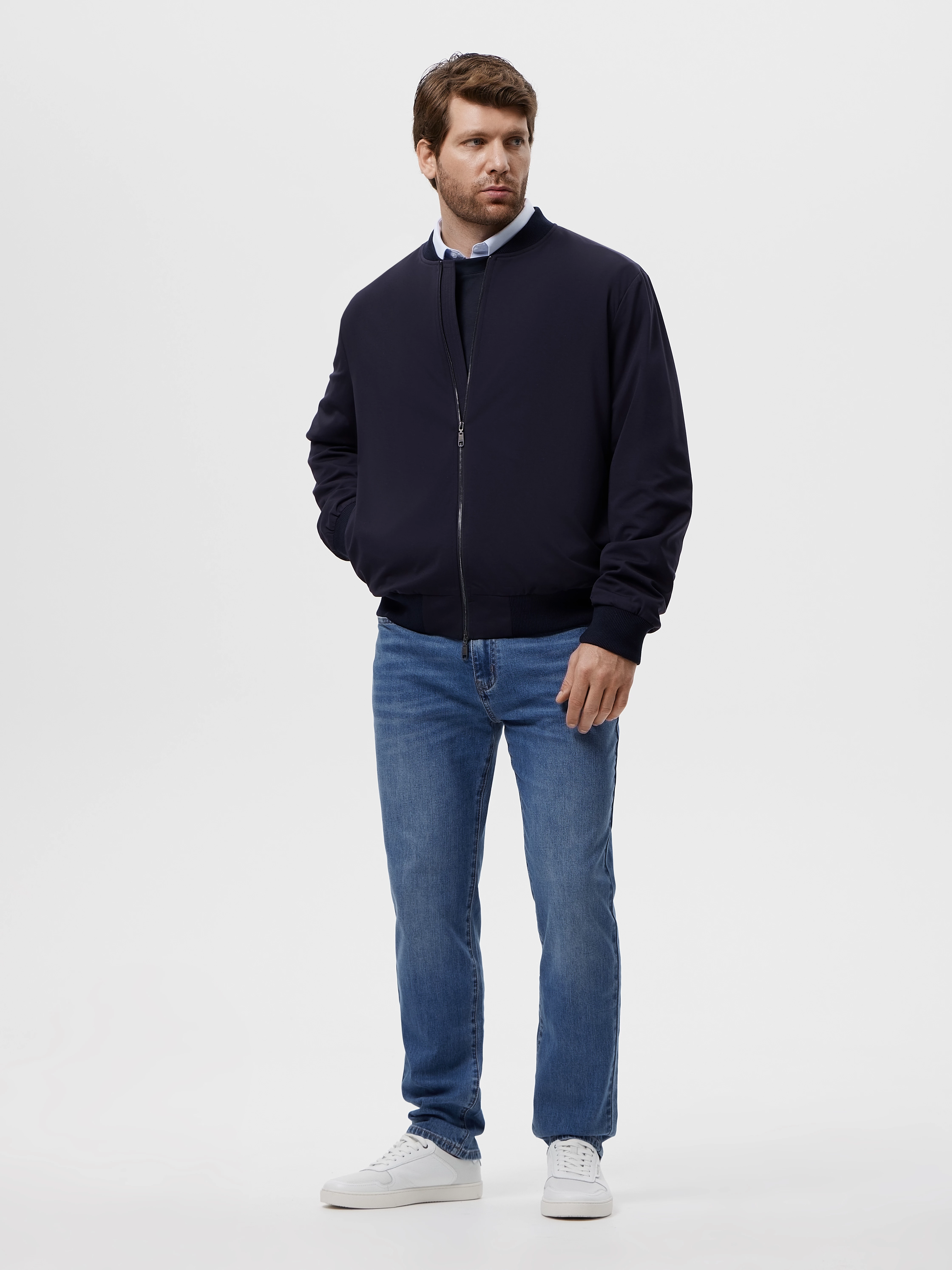Классический серо - синий бомбер прямого силуэта выполнен из плотного матового текстиля на основе хлопка и прочного полиэстера, который прошел дополнительную водоотталкивающую обработку Water Repellent. Такой материал не боится ветра, поэтому в нем будет тепло и комфортно в прохладные дни. Модель с застежкой на молнию и большими накладными карманами. Трикотажные манжеты и эластичная резинка по низу изделия обеспечивают комфортную посадку по фигуре. Бомбер будет прекрасным дополнением к джинсам или брюкам-чинос для стильного и повседневного образа.