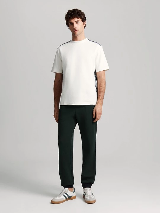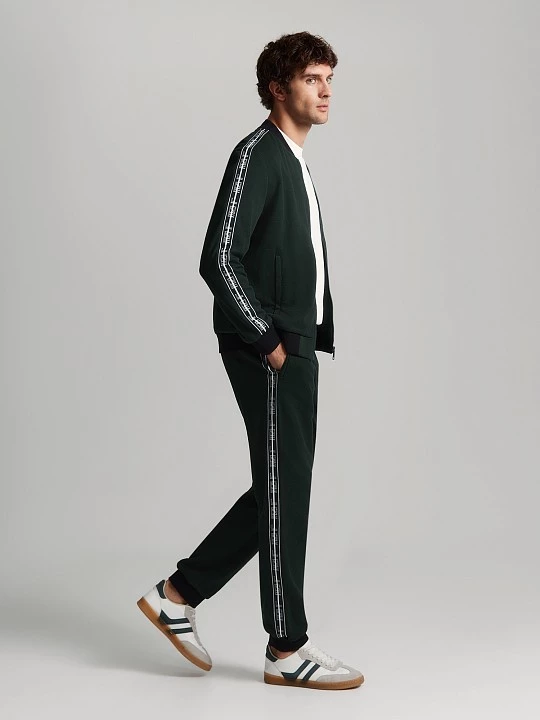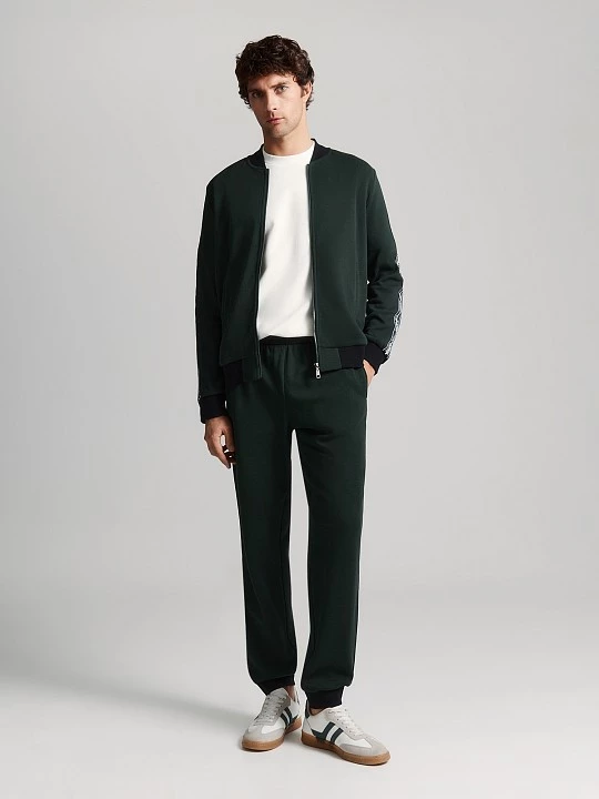 Брюки среднего объема с притачным контрастным черным поясом на резинке, шнуре с лаконичными эглетами в тон основной ткани. Акцентные брендированные лампасы по боковым швам вытягивают силуэт, а фиксация по низу брючин на манжеты позволяет сделать модель более актуальной. Комфортный крой и функциональные детали делают брюки идеальным выбором для современных мужчин, стремящихся к сочетанию стиля и практичности в повседневной жизни. Выбрали для брюк трикотаж-пике хорошей плотности в темно-зеленом цвете "платан". Уверенный черный цвет отделки модели делает ее универсальной и легко сочетаемой с другими элементами гардероба. Пике легко узнать – благодаря особому переплетению нитей, на лицевой стороне изделия Вы можете увидеть рисунок, напоминающий соты. У трикотажа пике высокие эксплуатационные характеристики – он прочный, износостойкий, очень хорошо пропускает воздух и впитывает влагу за счет высокого содержания хлопка. Дополнительно брюки оснащены карманами с вертикальным входом и листочкой, которые надежно застегиваются на молнию. Это позволяет удобно хранить необходимые мелочи, такие как ключи или телефон, не беспокоясь о том, что они могут выпасть. Задний карман с листочкой выполнен в поддержку стиля.