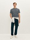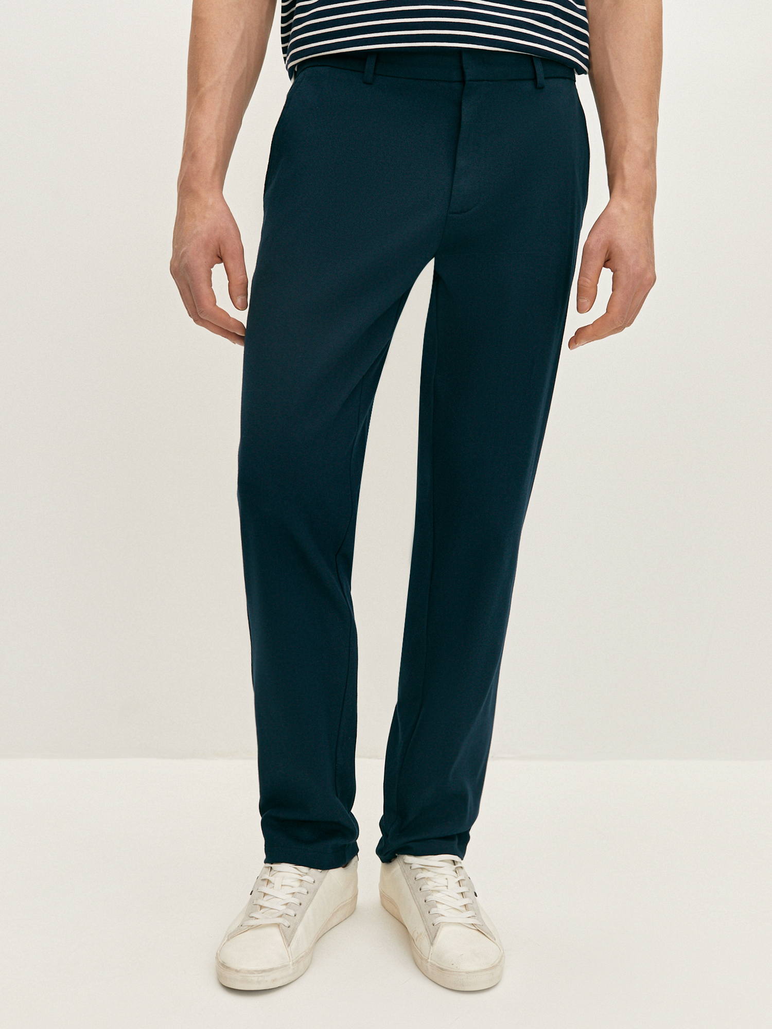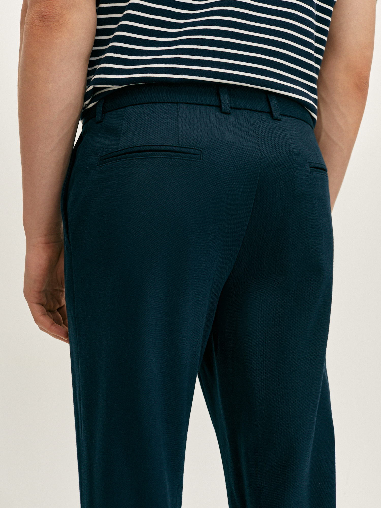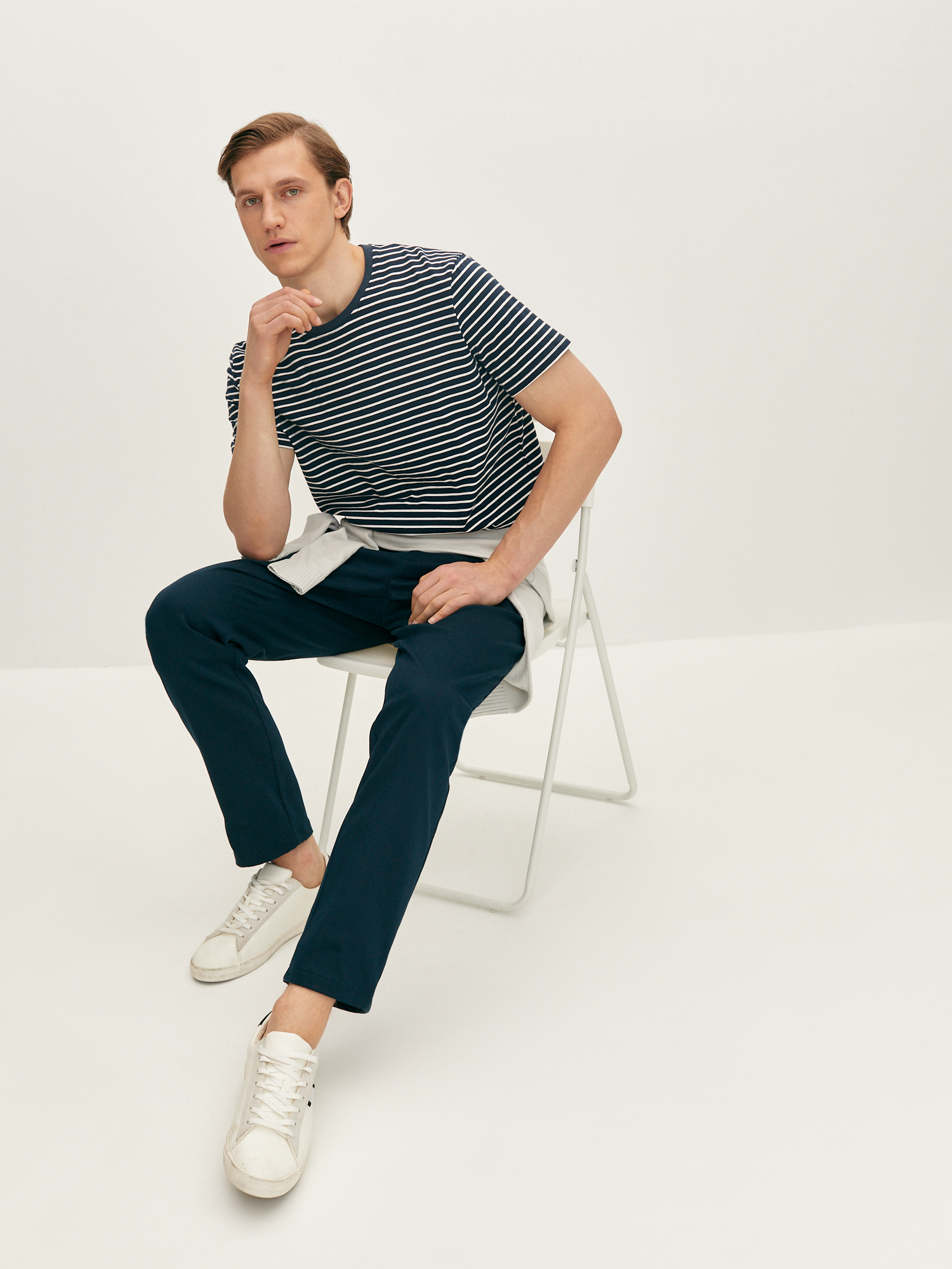 Комфортные брюки классического темно-синего оттенка. Выполнены из приятного фактурного материала на основе органического хлопка, а эластичные волокна в составе ткани обеспечивают идеальную посадку на любую фигуру. Модель полуприлегающего силуэта, с притачным поясом со шлёвками под ремень и прорезными боковыми карманами. С брюками можно создать интересные образы в стиле smart casual, сочетая их с базовыми футболками или джемперами.