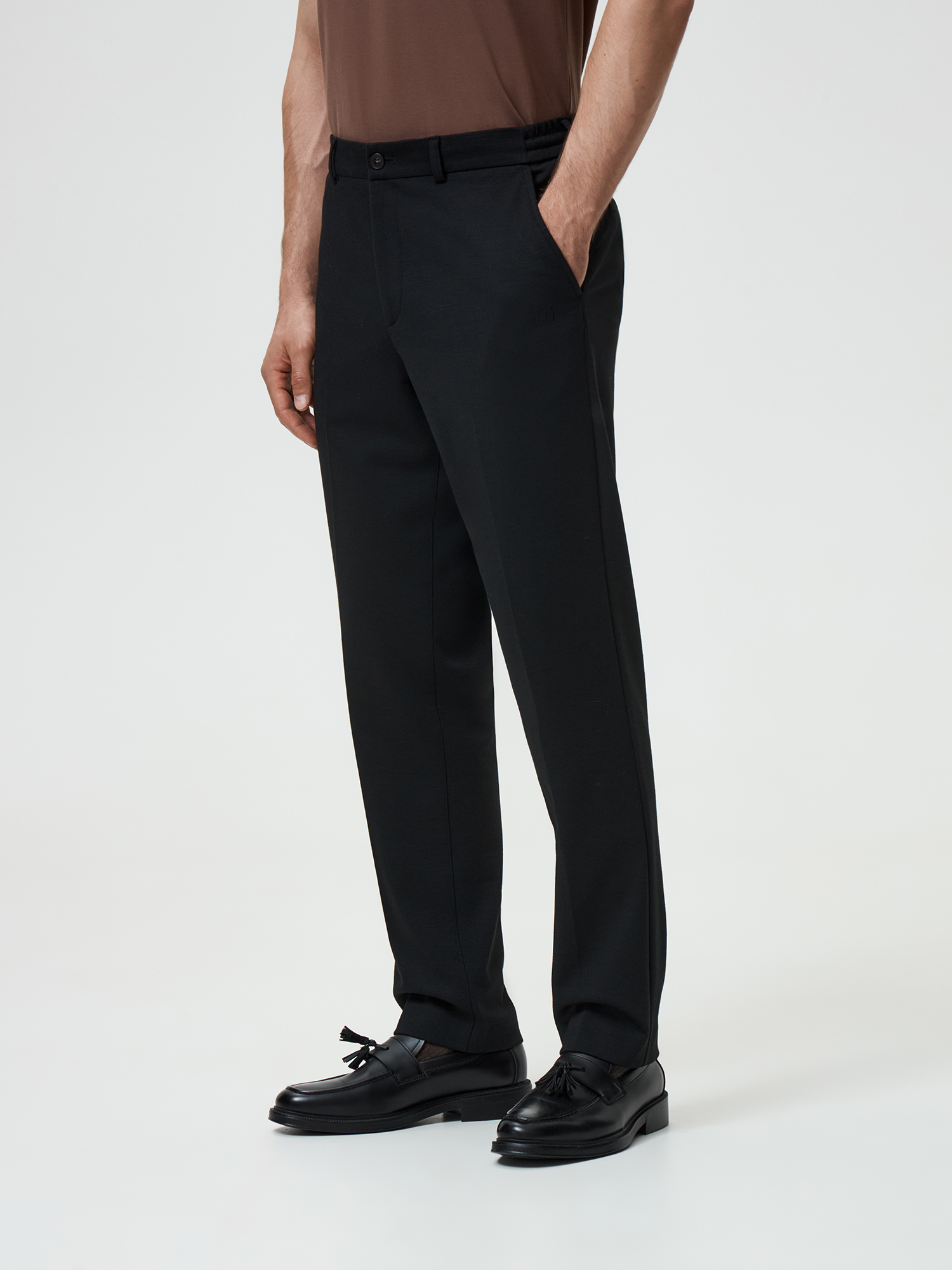 Стильные брюки прямого кроя с легким заужением, выполненные из эластичного шерстяного трикотажа - отличный выбор для мужчин, ценящих комфорт и презентабельность в повседневной жизни. Притачной пояс со шлевками и застежка-гульфик обеспечивают надежную посадку, а косые боковые карманы удобны.