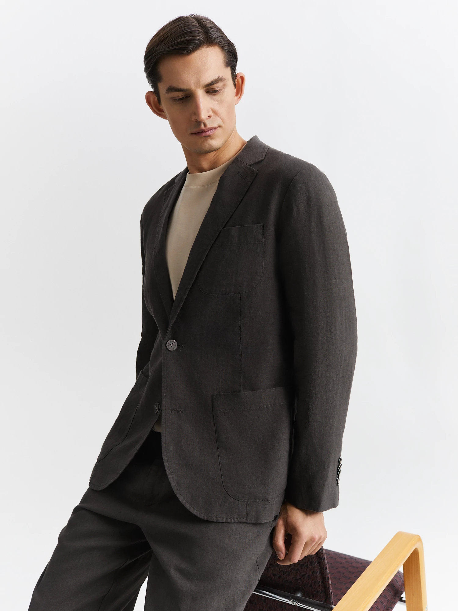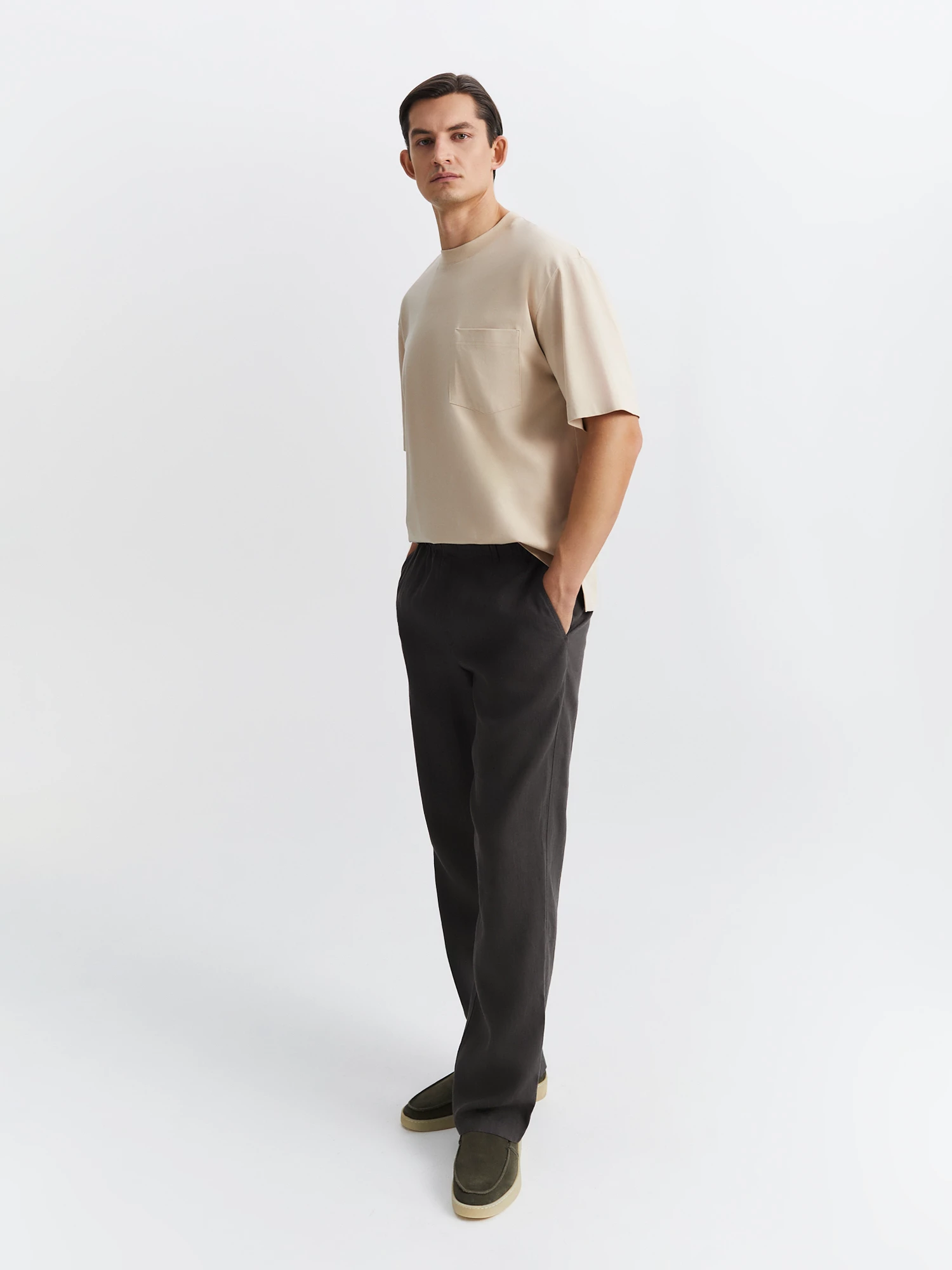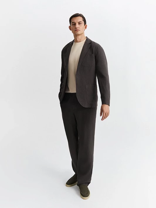 Брюки оттенка хаки прямого силуэта выполнены из высококачественного льна. Легкий дышащий материал комфортен для жаркого летнего периода. Модель свободного кроя с практичными боковыми карманами и поясом на резинке со шлевками под ремень обеспечивает комфортную посадку для любого типа фигуры. В сочетании с льняным однобортным пиджаком из комплекта станет идеальным решением в создании расслабленного и стильного образа.