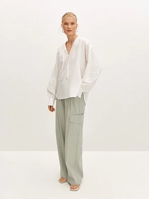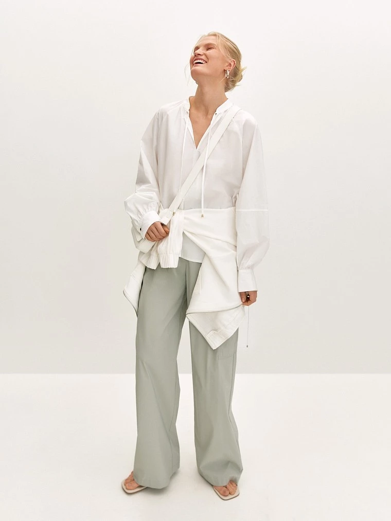 Трендовые брюки-карго мягкого серо-зелёного оттенка с крупным накладным карманом. Мы выбрали для брюк качественную костюмную ткань на основе вискозы с добавлением эластичных волокон. Модель прямого силуэта и свободного кроя. Брюки дополнены косыми боковыми карманами, а эластичный пояс с кулиской и лёгкие защипы обеспечивают идеальную посадку по фигуре. Брюки легко дополнят спортивный или неформальный городской образ.