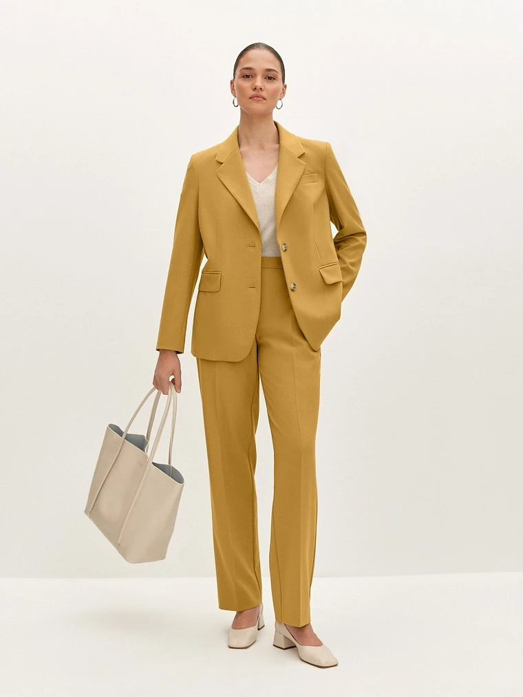 Классические брюки яркого горчичного оттенка со стрелками из эластичной поливискозы. Модель прямого силуэта, полной длины и застежкой на молнию и пуговицу. Пояс на резинке обеспечивает удобную посадку на талии. Брюки идеально сочетаются с различными блузами и топами, а с пиджаком из этой коллекции создадут классический деловой образ.