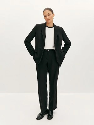 Классические брюки со стрелками чёрного цвета. Выполнены из плотной костюмной ткани с добавлением вискозы. Этот высококачественный материал прост в уходе и надолго сохраняет первозданный внешний вид. Модель прямого силуэта с притачным поясом со шлёвками под ремень и косыми карманами. Моделирующие вытачки сзади и резинка на поясе обеспечивают комфортную посадку по фигуре.