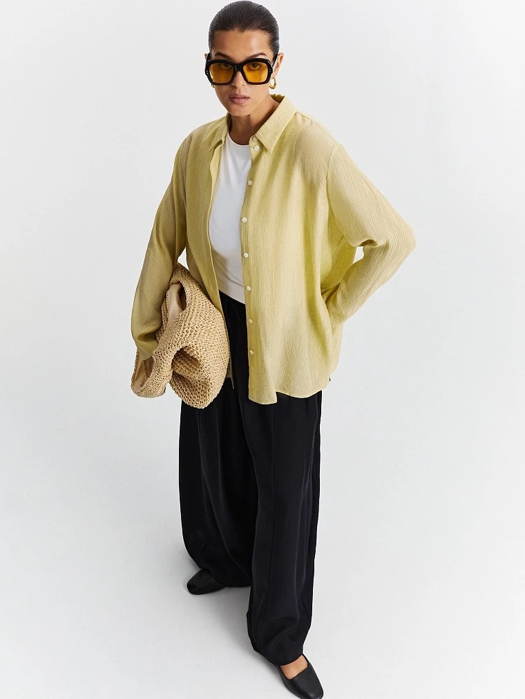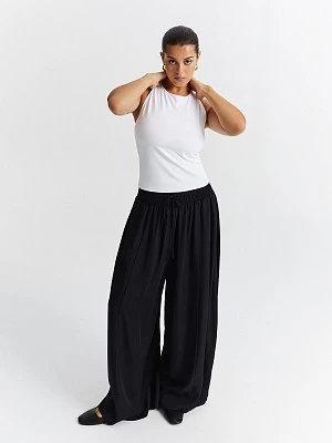 Расклешенные брюки черного цвета выполнены из 100% вискозного полотна. Материал из древесной целлюлозы отлично пропускает воздух и приятен к телу. Благодаря свободной посадке, эластичному поясу на резинке и мягкой драпировке, брюки будут эффектно смотреться на фигуре любого типа. В сочетании с футболками и топами из коллекции создадут комфортные образы на каждый день.