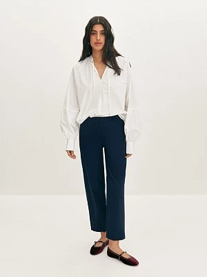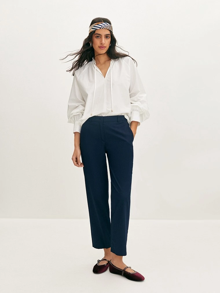 Для изготовления темно-синих брюк был выбран 100% хлопок. Устойчивый, исключительно легкий и дышащий материал хорошо держит четкость линий, заданных кроем. Прямая, слегка зауженная к низу модель с высокой посадкой поможет визуально удлинить ноги, а наличие косых карманов и вставки из резинки на поясе помогут ощутить комфорт и расслабленность. Темный тон брюк придает образу строгости и элегантности, делая модель максимально функциональной. Брюки легко подстроятся под ваш гардероб и станут базой для повседневного образа.