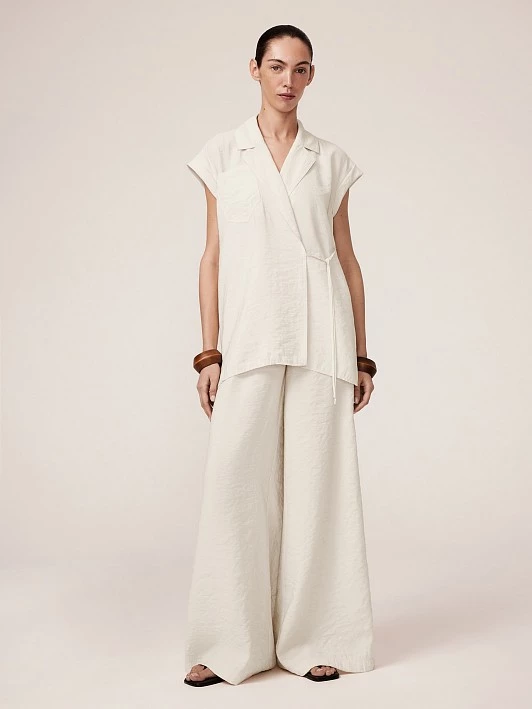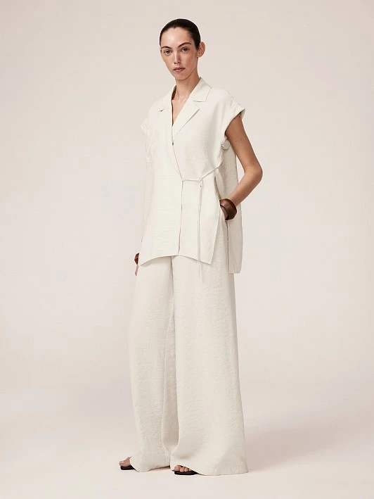 Струящиеся брюки из ткани производства Турции с эффектом крэш — это воплощение современной эргономичности и деловой эстетики. Благородный молочный оттенок становится универсальной основой для любых сочетаний как внутри капсульной коллекции, так и за ее пределами. Прямой крой с притачным поясом создает строгий силуэт, в то время как разнонаправленные складки обеспечивают неожиданную свободу движений. Традиционная застежка на молнию и косые функциональные карманы сохраняют чистоту линий, не жертвуя практичностью. Сшитые из турецкой ткани с эффектом легкого крэша, брюки сочетают экологичный модал с практичным полиэстером: это невероятная нежность, которая сохраняет безупречный вид весь день. Дышащая легкая модифицированная вискоза прекрасно дополняется прочным поливолокном, что улучшает как визуальные, так и функциональные характеристики полотна. Брюки, где каждая деталь выражает комфорт и уверенность.