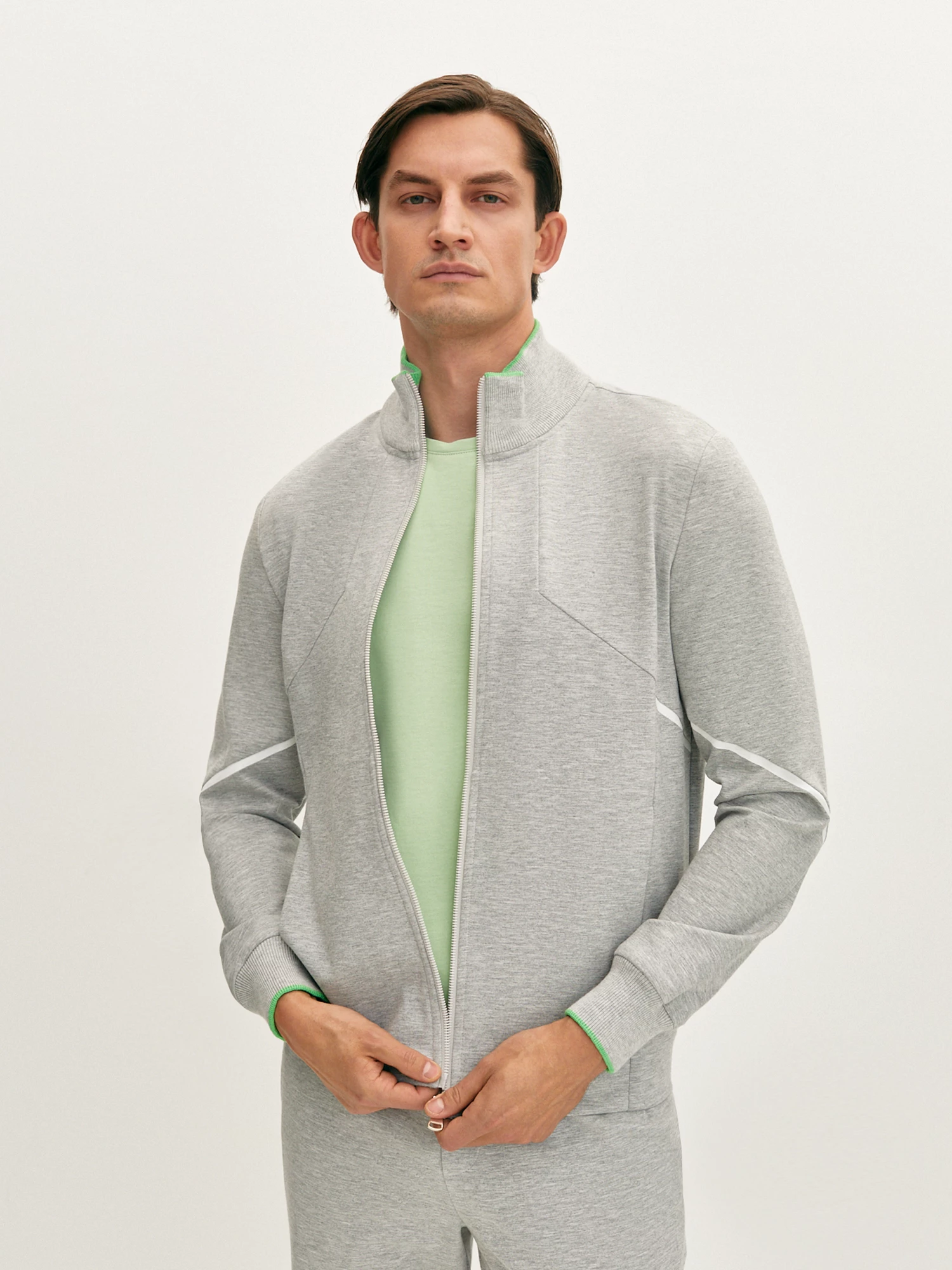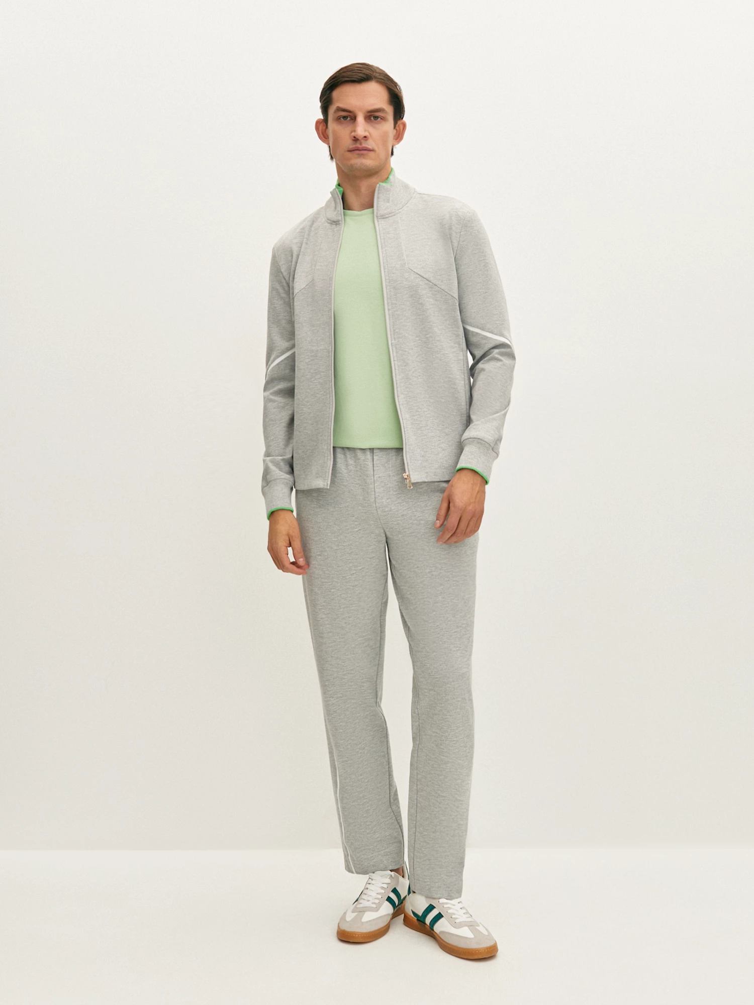 Спортивные брюки светло-серого цвета прямого силуэта. Серый цвет является универсальным и подойдет для расслабленных и спортивных образов. Модель из гладкого и прочного вискозного трикотажа, поясом на резинке и внутренним шнуром обеспечивает комфортную посадку. Брюки дополнены декоративными подрезами и белыми элементами по низу. Для создания спортивного образа рекомендуем сочетать с легкой толстовкой из коллекции.