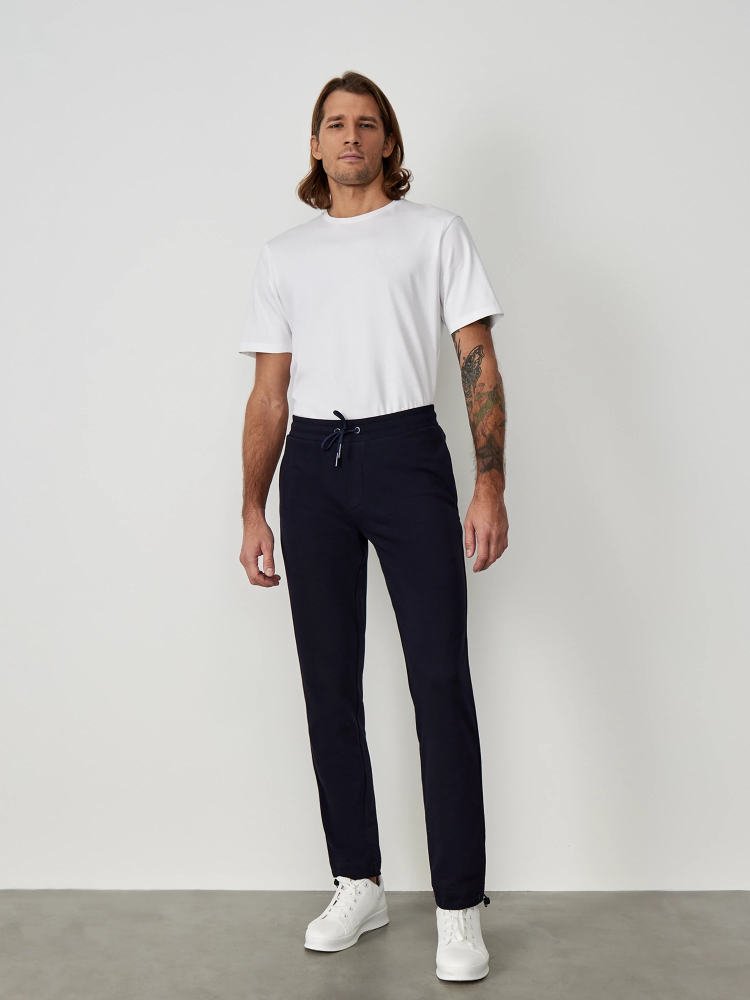 Стильные спортивные брюки из мягкого хлопкового трикотажа универсального темно-синего цвета. Модель комфортного прямого кроя, с эластичным поясом на резинке и завязках, двумя прорезными карманами в боковых швах с потайной тесьмой-молнией и одним накладным карманом сзади. Дизайнерское решение - по низу брючины кулиска, которую можно затянуть, благодаря этому брюки легко трансформируются в джоггеры. Сочетаются в качестве костюма с толстовкой из той же коллекции, а также с базовыми однотонными майками и спортивной обувью.