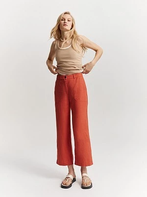 Укороченные льняные брюки терракотового оттенка. Натуральная льняная ткань премиального качества обеспечивает комфорт в течение всего дня. Модель прямого кроя, свободной посадки, с мягким поясом и накладными карманами по бокам. Хорошо будут смотреться с вязаными топами и светлыми футболками. В паре с блузой из той же ткани составят однотонный тотал-лук. Образ дополнят открытые босоножки или мюли.