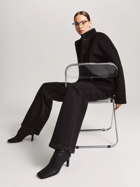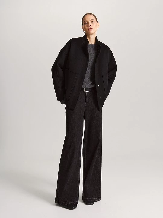 Стильная куртка на кнопках по функционалу напоминает пальто или тонкий пуховик. Модель из черной шерстяной ткани с поливискозной подкладкой и и утеплителем из синтепона хорошо сохраняет тепло. Такое полотно хорошо подходит для создания моделей свободного стиля.