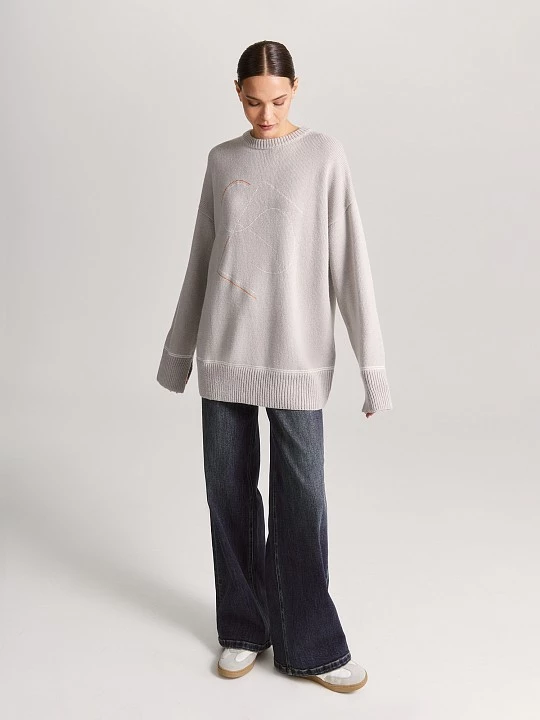 Вязаный удлиненный джемпер силуэта oversize с брендированной вышивкой. Разрезы по низу рукавов стилистически поддерживают свободный силуэт. Свитер из шерсти мериноса, цельновязаный, с резинкой по горловине, низу и манжетам, выполнен на японской плосковязальной машине Shima Seiki. Резинка по горловине прикетлевана премиальным эластичным швом. Брендированная вышивка также выполнена на собственном производстве, с помощью современного оборудования фирмы TAJIMA. Вязаные изделия из шерсти мериноса обеспечивают комфортную температуру для тела, хорошо тянутся и не сковывают движения. Теплый, однотонный, светло-бежевый, джемпер подойдет для не строгого офиса, школы, прогулки, встречи с друзьями.