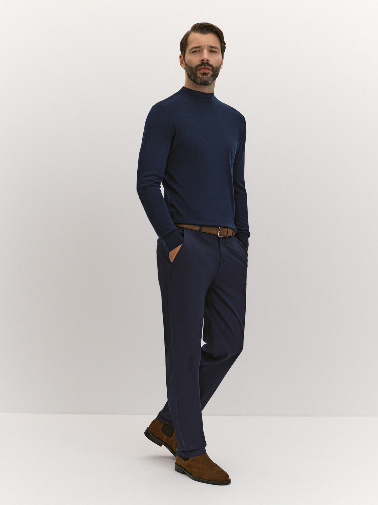 Классический джемпер из премиальной пряжи - хорошая инвестиция в базовый гардероб. Лаконичный дизайн модели делает ее подходящей для неформальных мероприятий, офиса, повседневной носки. Длинные рукава и воротник-полустойка добавляют уют и защищают от холода, а также позволяют создавать многослойные образы с рубашками, благодаря С-образной форме воротника. Джемпер выполнен из натуральной шерсти мериноса, известной своей мягкостью. Такой состав пряжи делает джемпер комфортным для ношения даже на голое тело. Терморегуляционные свойства шерсти обеспечивают комфортную температуру в любых условиях: она согревает в холод и охлаждает в тепло. Шерсть мериноса эластична, не сковывает движения и подходит для активного образа жизни. Темно-синий цвет выразителен, строг и элегантен. Крой модели комфортного облегания не стесняет движения, обеспечивая свободу и удобство. Кеттельная эластичная обработка швов делает их практически незаметными, что подчеркивает высокое качество изделия и обеспечивает долговечность. Высокий 18-й класс вязания — это вершина технологий в трикотажном производстве. Он гарантирует тонкость и премиальное качество вязаного полотна, создавая изделия, которые сочетают в себе легкость, комфорт и роскошь. Такой джемпер — прекрасный выбор для тех, кто ценит внимание к деталям и стремится к совершенству своего гардероба.