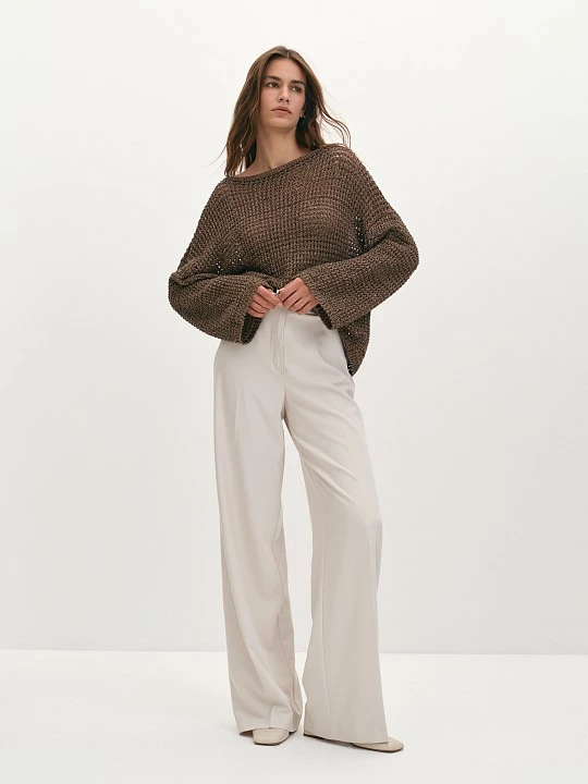 Джемпер-сетка, выполненный из фантазийной пряжи итальянского производства, представляет собой яркий пример современного вязаного искусства. Основой для этой модели послужила уникальная пряжа, состоящая из натурального хлопка и полиэстера. Хлопок обеспечивает мягкость и комфорт, в то время как полиэстер придаёт изделию износостойкость и прочность, что делает джемпер идеальным для повседневного использования. Фантазийная пряжа коричневого цвета с черной оплеткой создает выразительный визуальный эффект, который привлекает внимание и добавляет оригинальности. Это сочетание цветов и текстур, дополненное ажурной вязкой, позволяет создать эффектный джемпер-сетку с переливами цвета, который будет прекрасно смотреться как в повседневной, так и в более нарядной обстановке. Джемпер имеет горловину-лодочку, что подчеркивает линию шеи и придаёт образу женственность. Низ изделия и манжеты связаны резинкой, что обеспечивает удобство и комфорт при носке, а также помогает сохранить форму изделия. Все детали джемпера были вывязаны точно по лекалу на японской плосковязальной машине Shima Seiki, что гарантирует высокое качество и долговечность. Использование этой технологии позволяет достичь идеальной точности в вязании, что особенно важно для создания сложных узоров и текстур. Соединительные швы выполнены на кеттельном оборудовании, что является признаком премиального подхода к производству. Эта дорогая обработка обеспечивает эластичное и практически незаметное соединение, что делает джемпер ещё более комфортным в носке и не стесняет движений. Таким образом, джемпер-сетка из фантазийной пряжи не только отражает актуальные модные тренды, но и является универсальным элементом гардероба, который легко комбинируется с различными предметами одежды. Он станет отличным выбором для создания стильных образов, добавляя в них нотку оригинальности и утонченности.