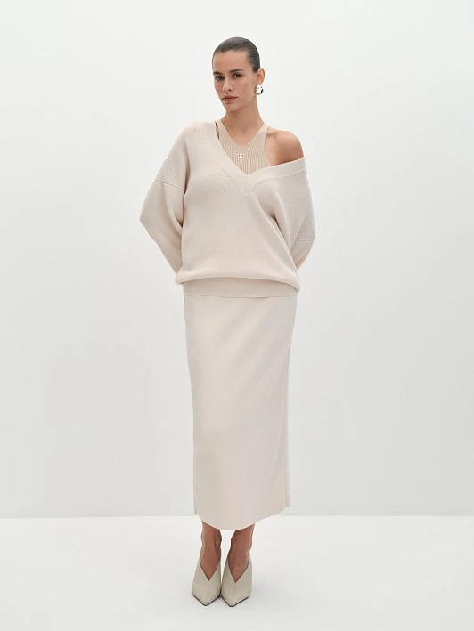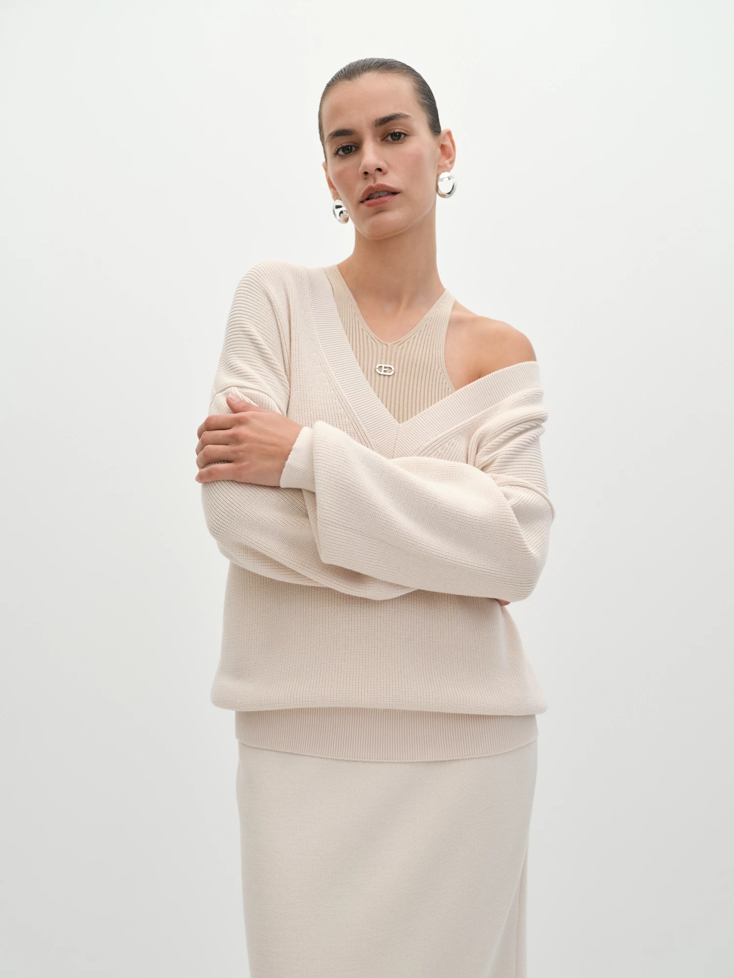 Выбрали для джемпера в трендовом сливочном оттенке силуэт оверсайз с актуальным глубоким V-вырезом и длинным рукавом со спущенным плечом. Особую визуальную легкость, воздушность, придают модели рукава, наполненные книзу и фактурное переплетение полуфанг, которое еще называют английской резинкой. Использовали для создания модели премиальную итальянскую пряжу с легким блеском, на 100% состоящую из хлопка, гипоаллергенного, тактильно приятного и дышащего. Детали модели вывязаны точно по лекалу на японской плосковязальной машине Shima Seiki, а значит изделие будет хорошо держать форму и долго прослужит. Соединительные швы выполнены на кеттельном оборудовании особым способом "петля в петлю", это премиальная, дорогая обработка, позволяющая получить эластичное соединение.