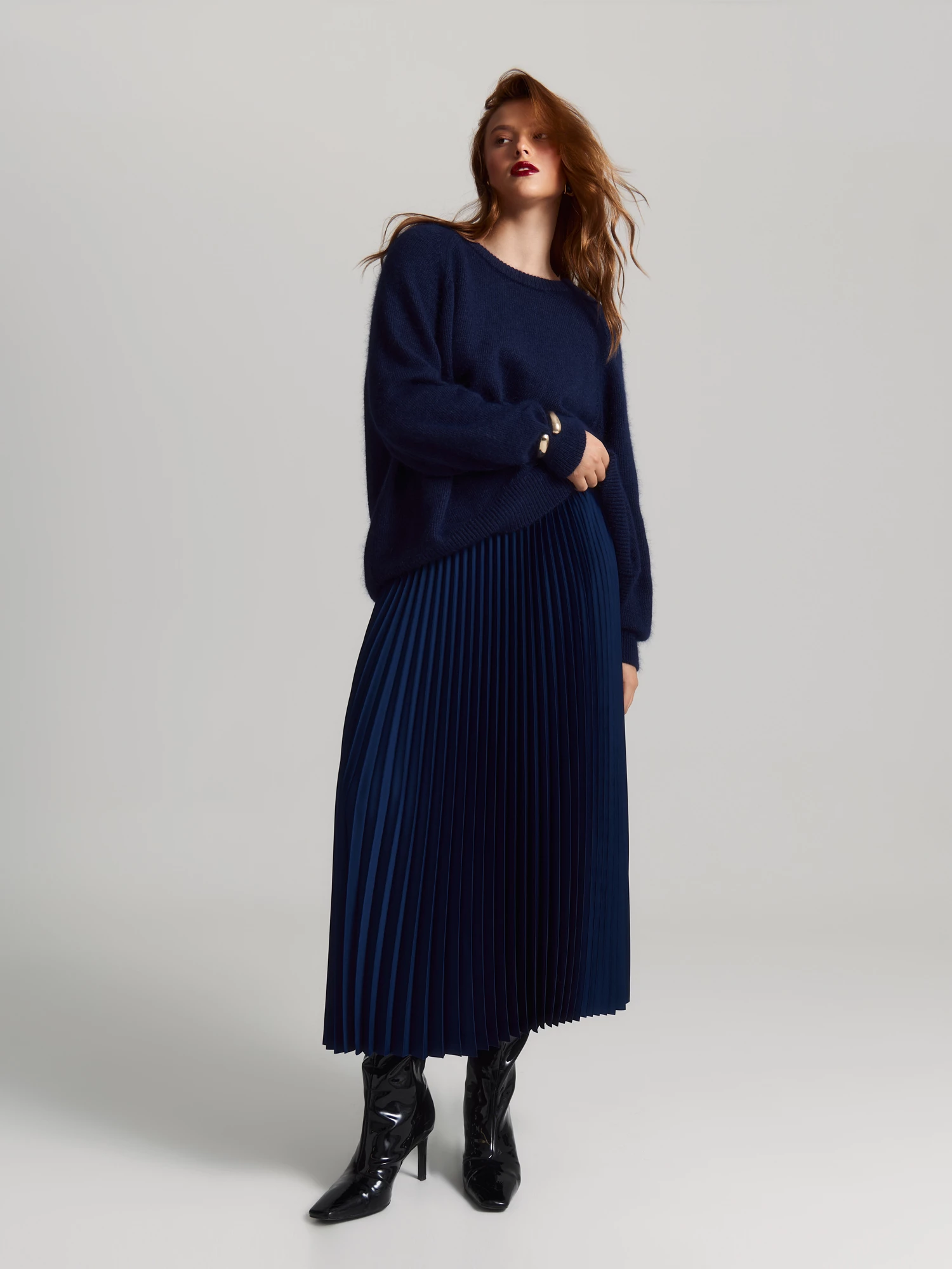 Джемпер в таинственном темно-синем прекрасно сочетается с юбкой SK0591 и подойдет для деловой встречи, офиса, прогулки.