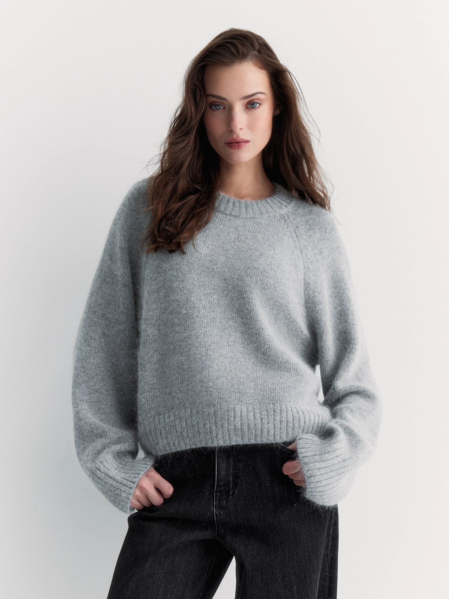 Укороченный джемпер аккуратного силуэта связан из нежной пряжи с ангорой и овечьей шерстью. Он очень мягкий, тёплый, с хорошей терморегуляцией. Выполнили модель с круглой горловиной и рукавом-реглан - удобно сидит и не сковывает движения.