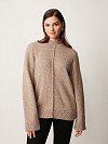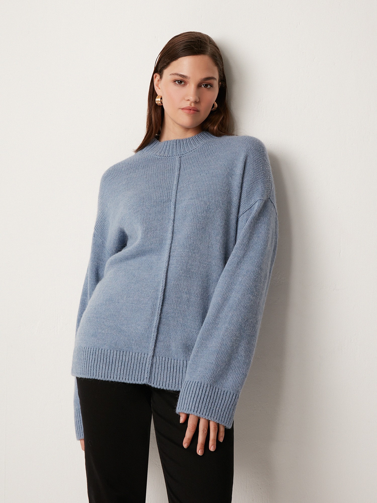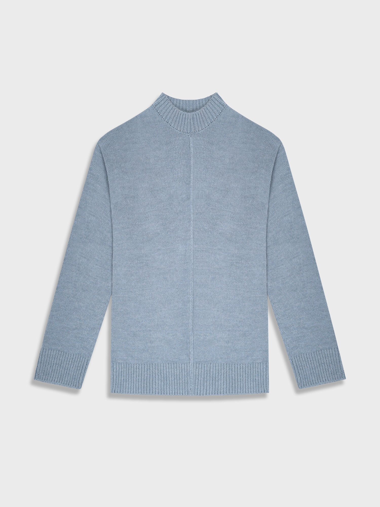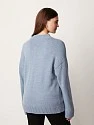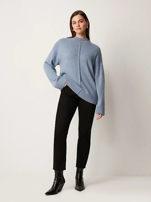 Уютный вязаный джемпер серо-голубого оттенка гладкого переплетения. Выполнен из тёплой, мягкой и приятной к коже пряжи с добавлением шерсти. Модель прямого кроя, среднего объёма, со спущенной линией плеча, длинным рукавом и воротником стойкой. Манжеты на рукавах, по низу изделия и воротник в крупный фактурный рубчик. Вертикальный декоративный шов визуально вытягивает силуэт. Удобный джемпер можно сочетать с джинсами, брюками или юбкой.