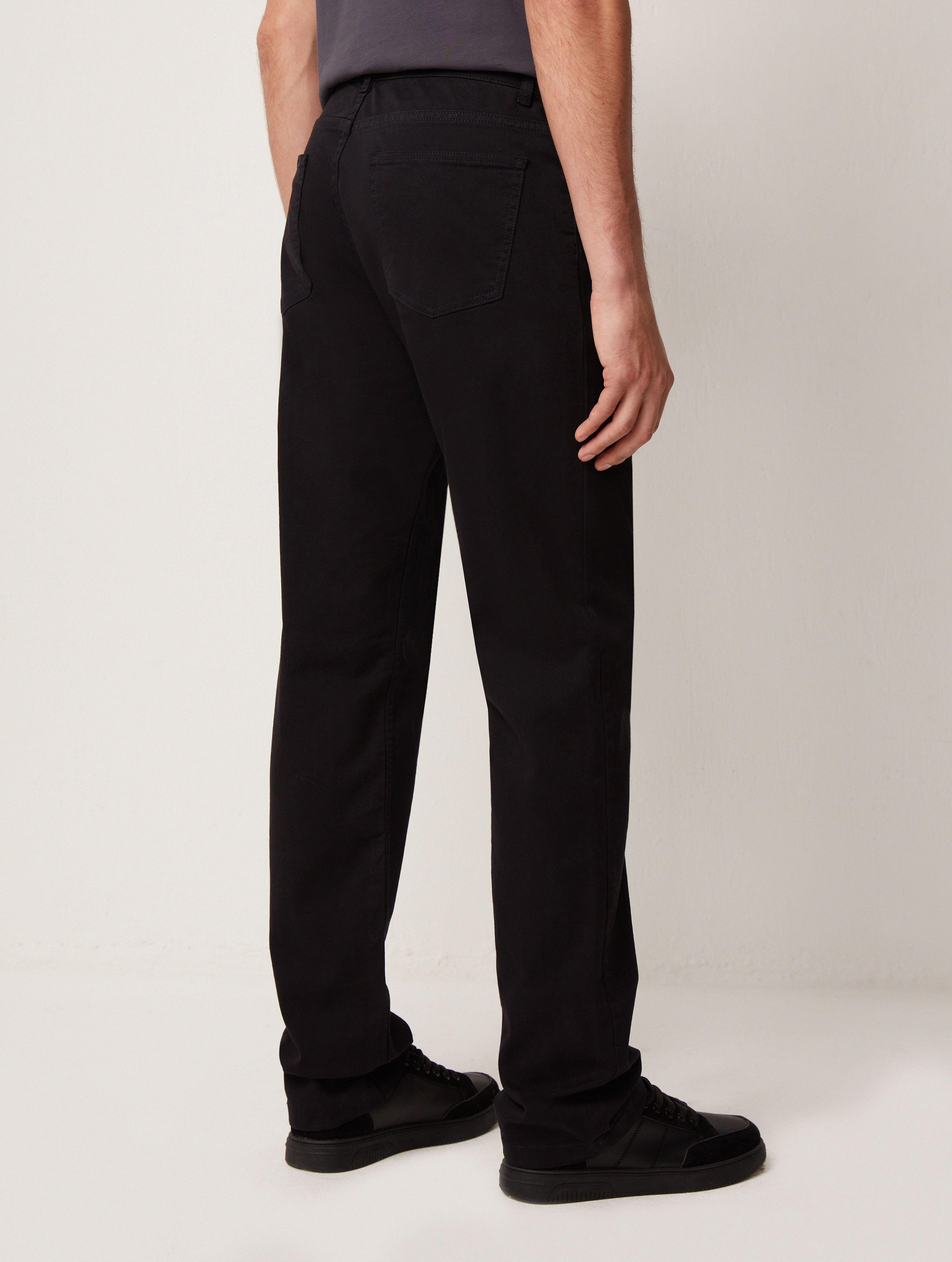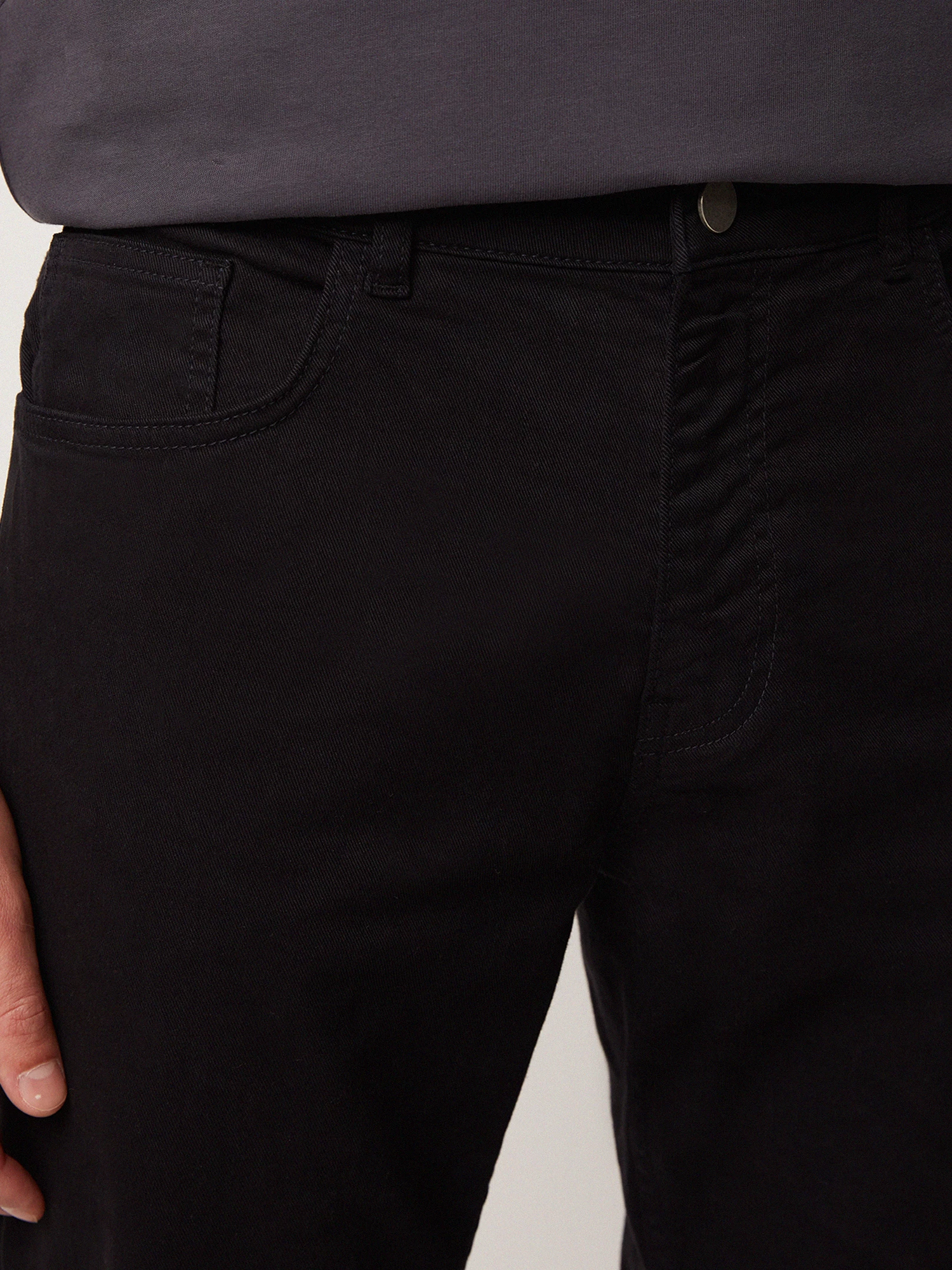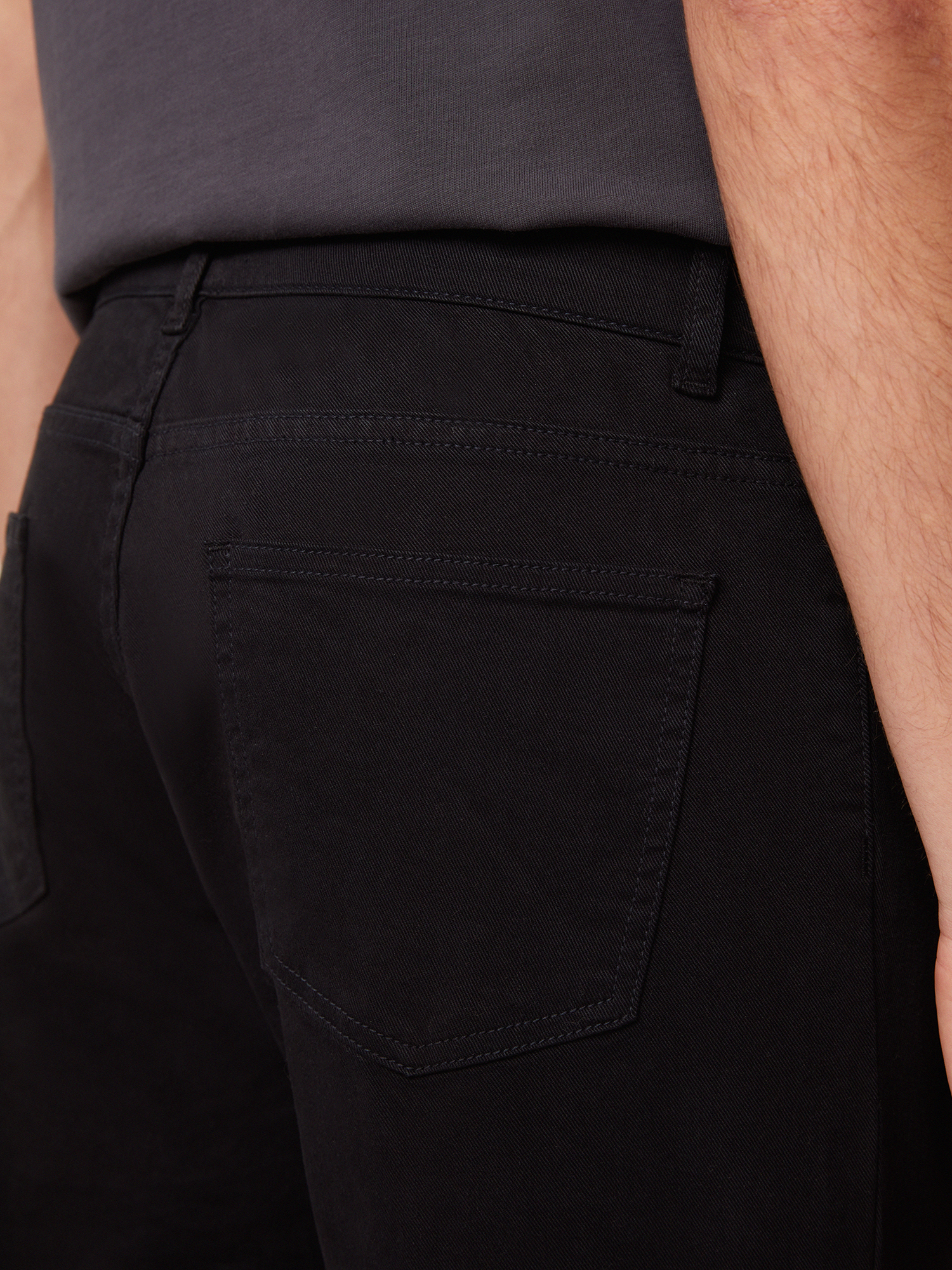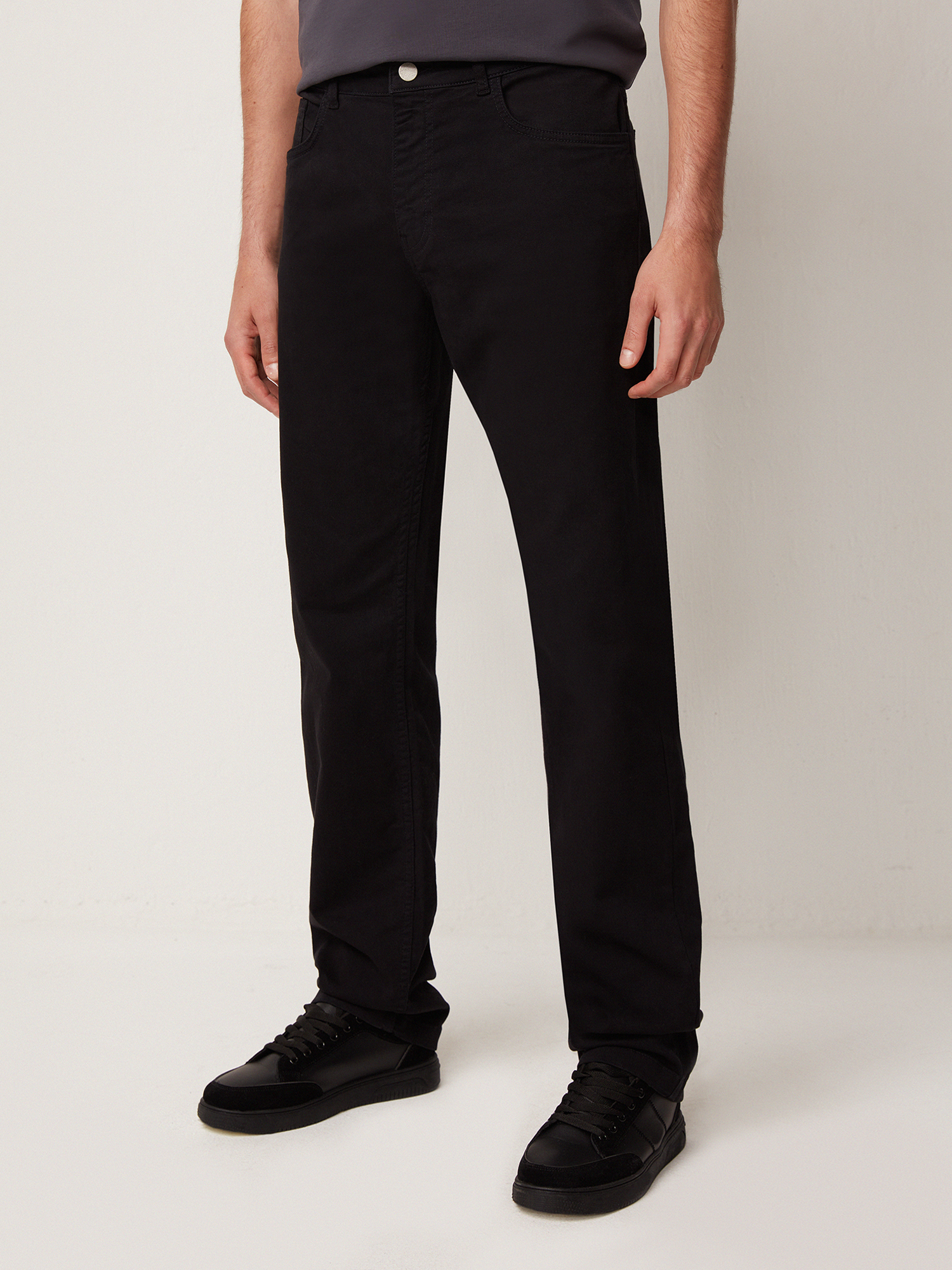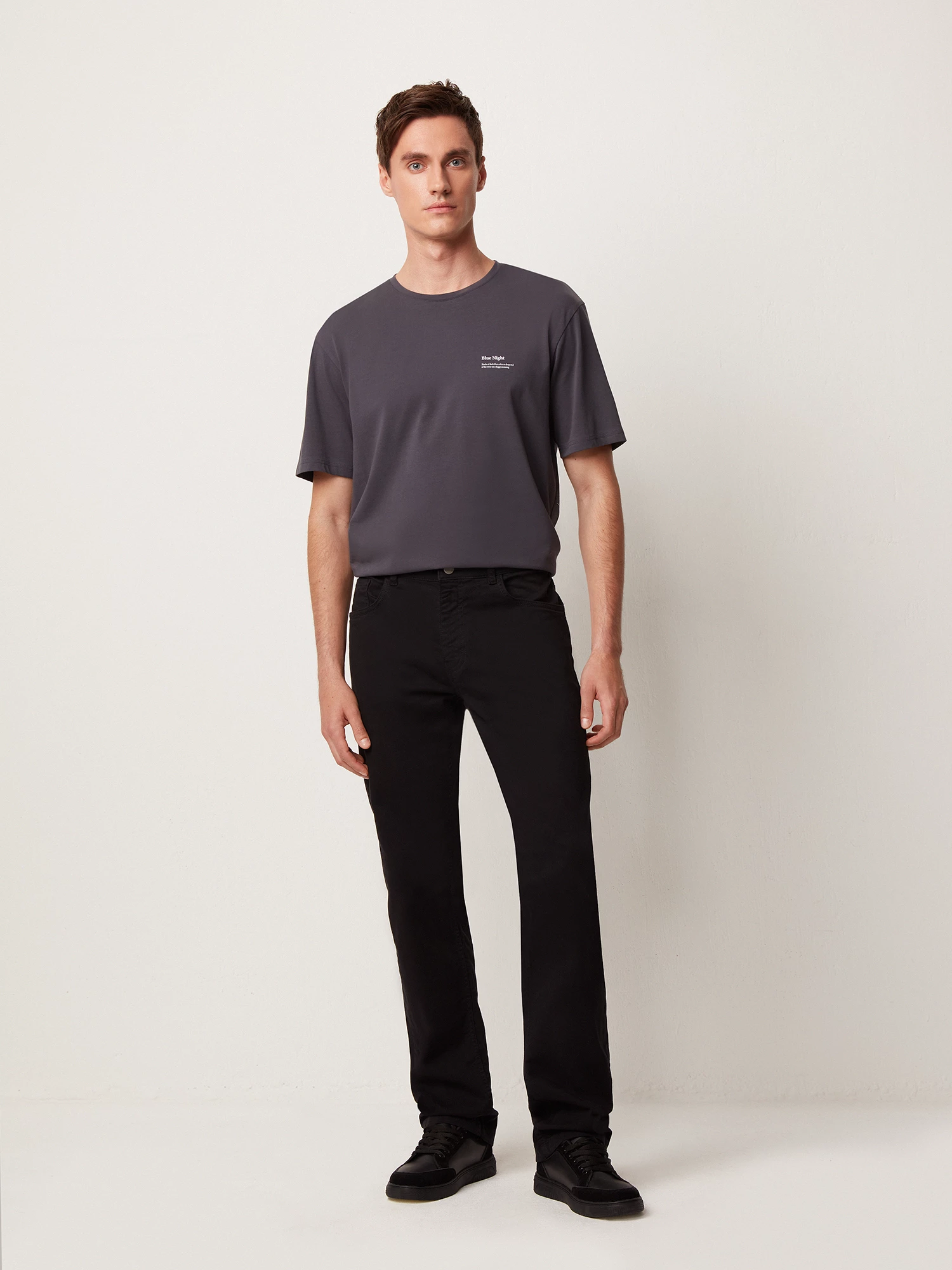 Базовые джинсы "5 карманов" практичного чёрного цвета выполнены из денима на основе хлопка с добавлением волокон эластана. Модель прямого силуэта, с притачным поясом со шлевками под ремень, боковыми карманами с часовым карманом спереди и накладными американскими сзади. Универсальные джинсы дополнят как лук в стиле кэжуал, так и станут альтернативой классическим брюкам для нестрогого офисного образа.