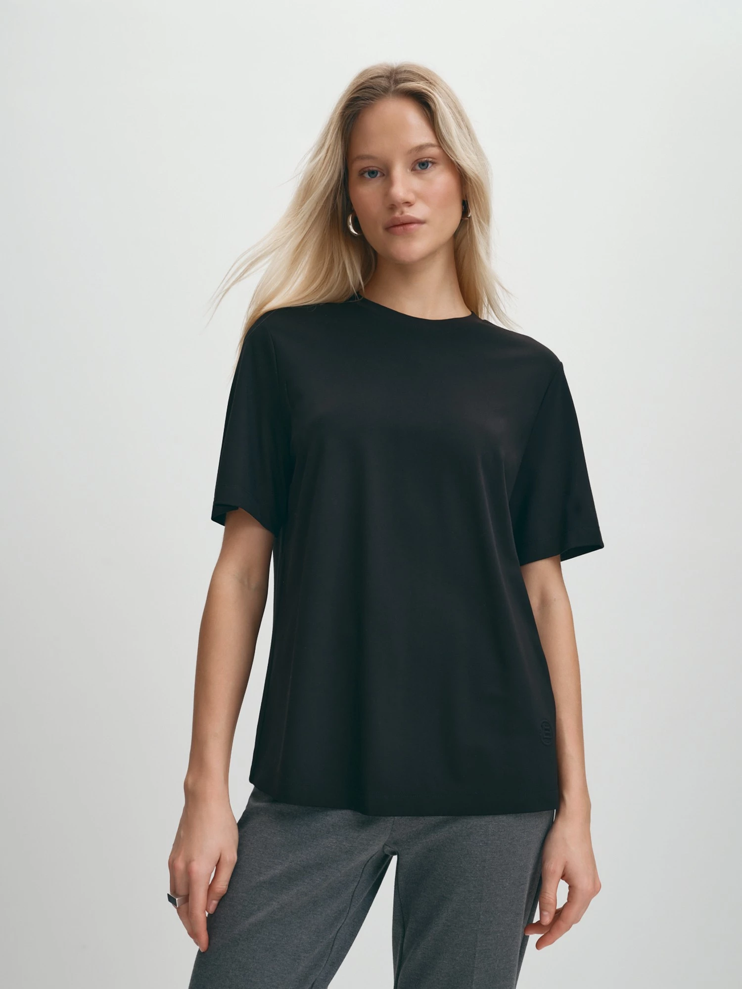Бренд: ElisЦвет: ЧерныйСостав: Хлопок - 100%Артикул: TS0083KРазмер на модели: 44Коллекция: В РАБОЧЕМ ГРАФИКЕ