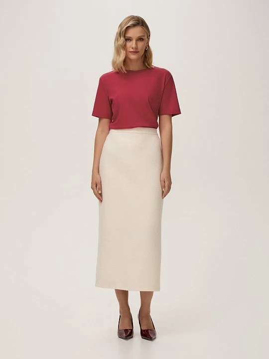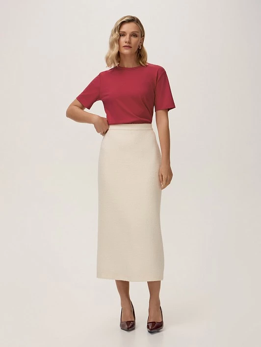 Малиновый оттенок футболки, без излишней яркости, прекрасно вписывается в палитру осеннего гардероба и станет ее акцентом.