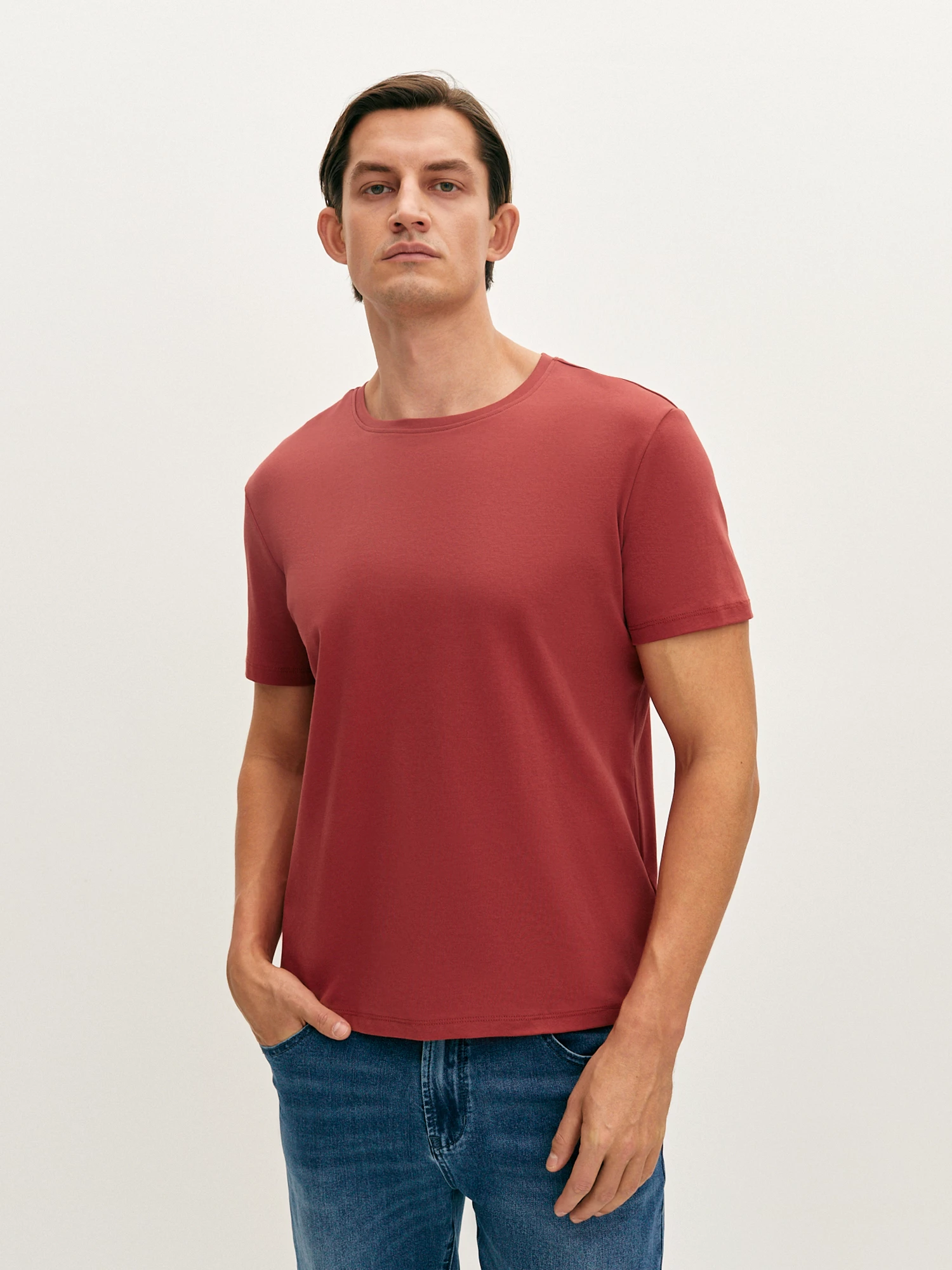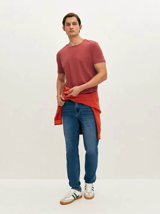 Лёгкая футболка практичного терракотового оттенка из мерсеризованного хлопка, который обеспечивает отличную воздухопроницаемость и комфорт в течение всего дня. Благодаря эластичным волокнам в составе, футболка идеально садится на любую фигуру, не сковывает движения. Модель прямого силуэта с коротким втачным рукавом и круглой горловиной. Футболка насыщенного терракотового цвета станет легким и верным способом расширить палитру повседневного гардероба.