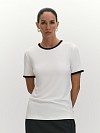Прилегающая футболка с коротким рукавом зайдет в гардероб как базовая, как единственный слой, и в качестве первого под жакеты и кардиганы. Модель выполнена из трикотажа рибана с высоким тактильным качеством, тонкого, но плотного. Это полотно износостойкое и эластичное. Такая модель в базовом черном цвете создает основу образа и не зависит от сезонов и трендов, контрастный кант футболки достойно завершит образ.
