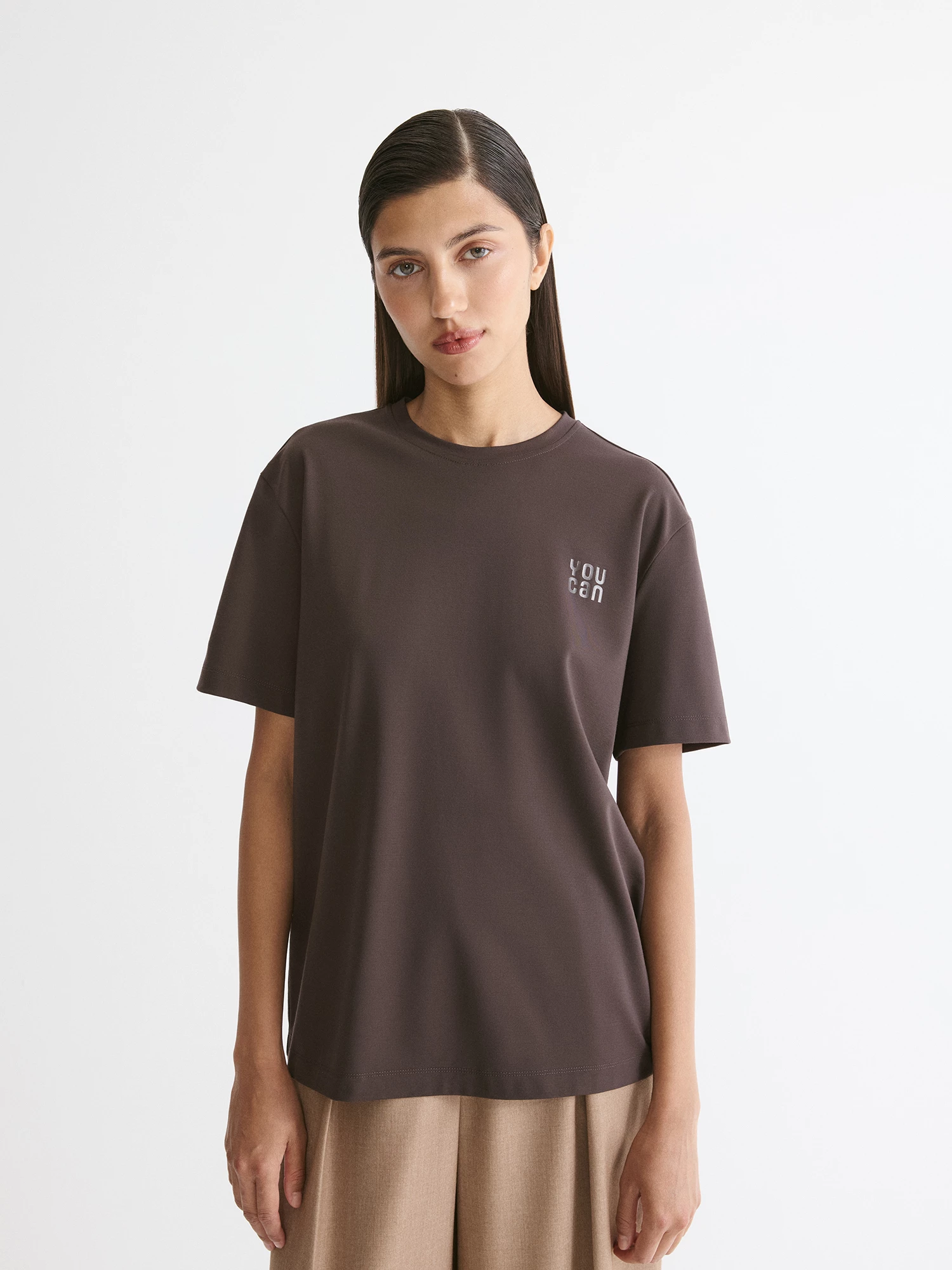 Футболка с лого-принтом You can (рус. "Ты можешь") - это продолжение манифеста, провозглашенного в рамках бренд-платформы ELIS "Выбираю себя". Выражая любовь и уважение к себе каждый день, женщина ELIS выбирает понятные четкие образы, дающие уверенность.
